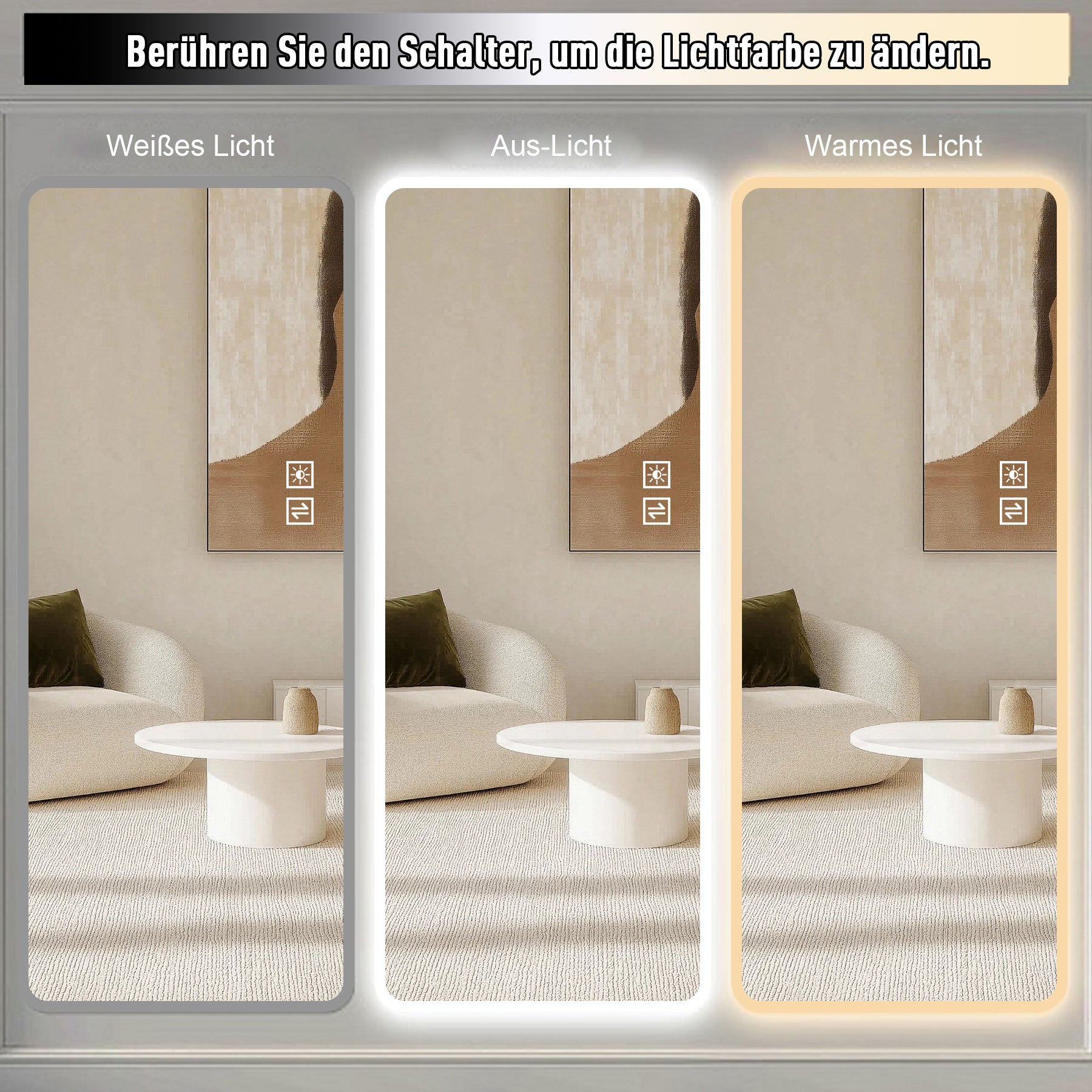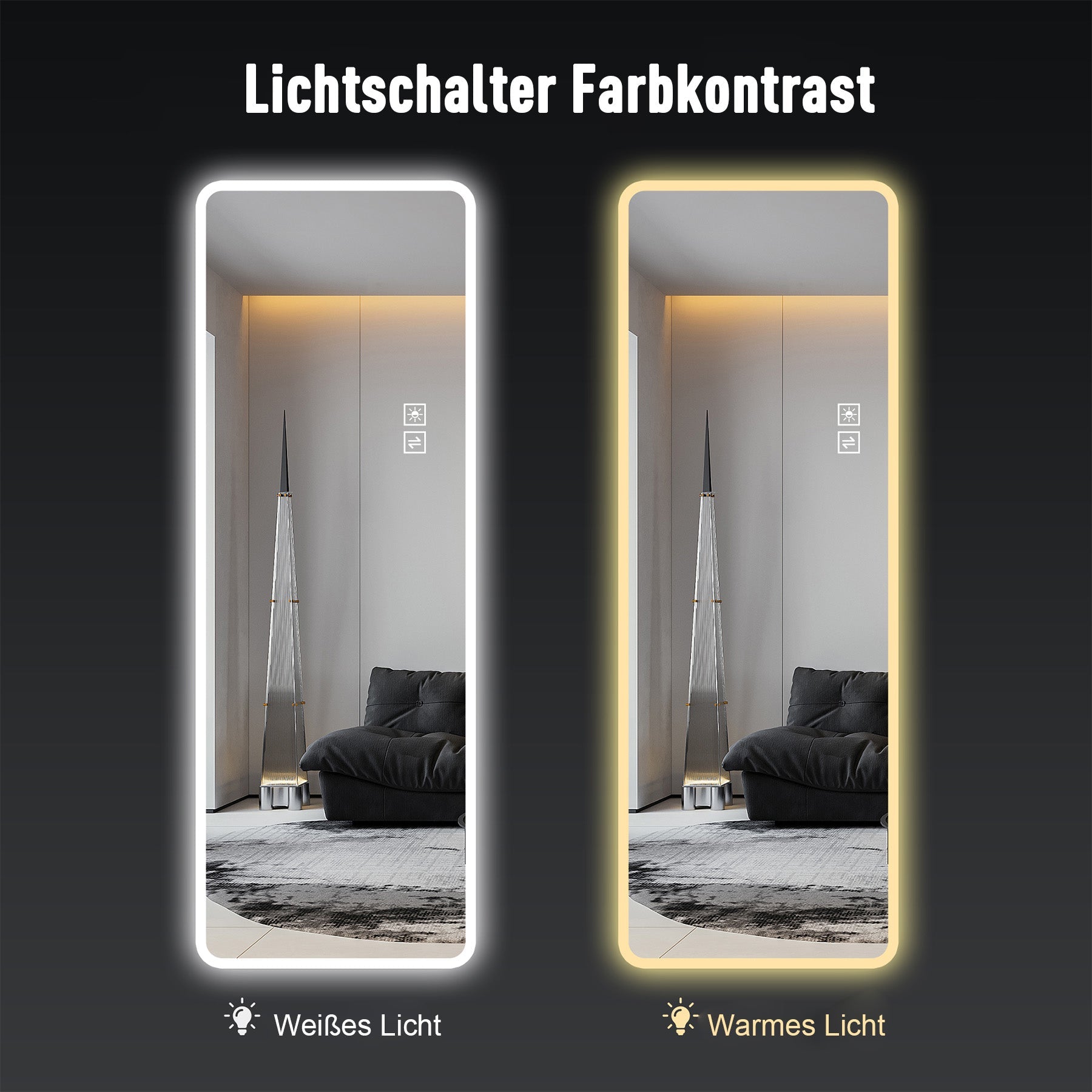 Easy to install and safe. The mirror includes two pendants for easy installation, allowing it to be wall-mounted or leaned against the wall. The driver is housed in a secure, waterproof outer box, making it suitable for placement in the bathroom. The lamp features a protective cover for enhanced aesthetics and safety.