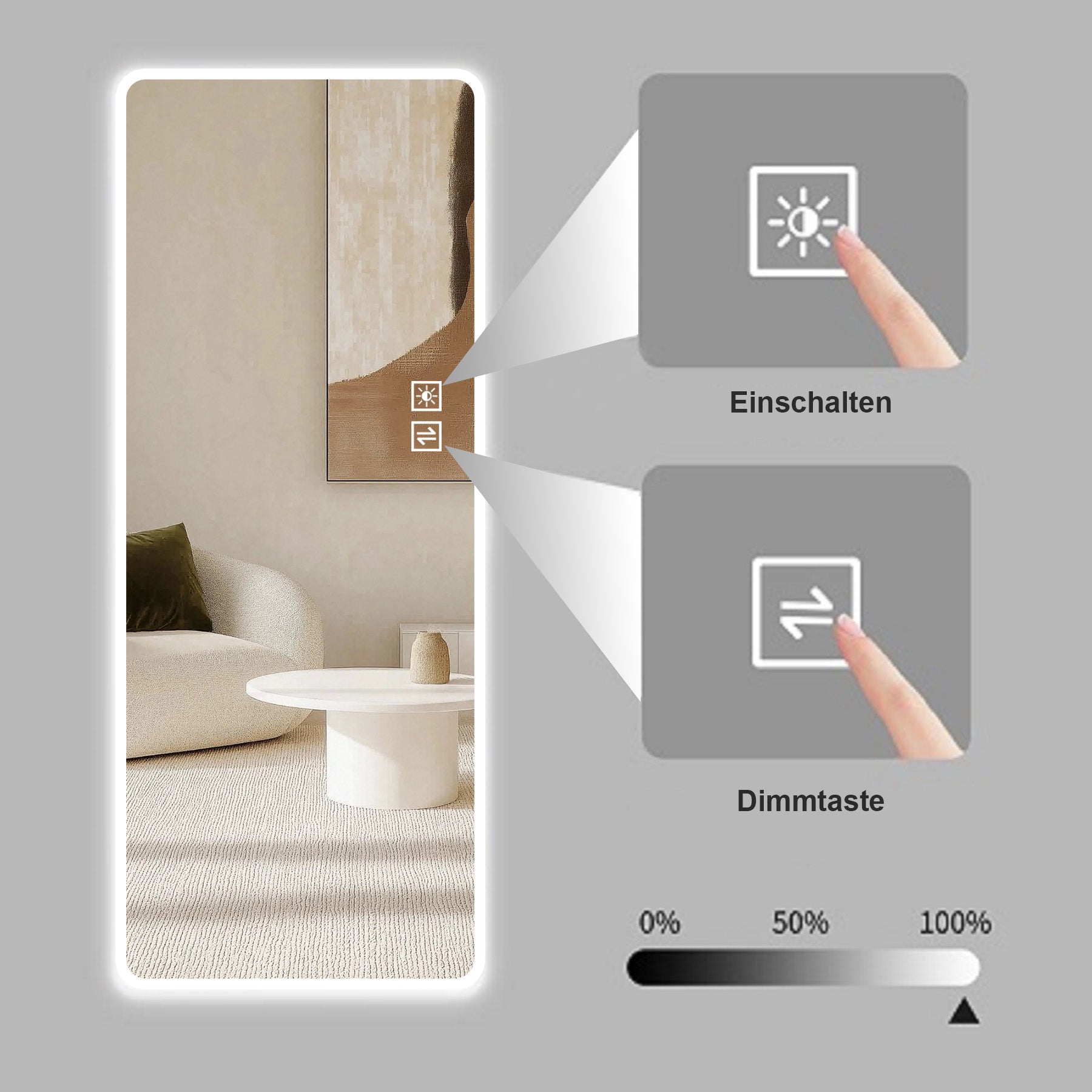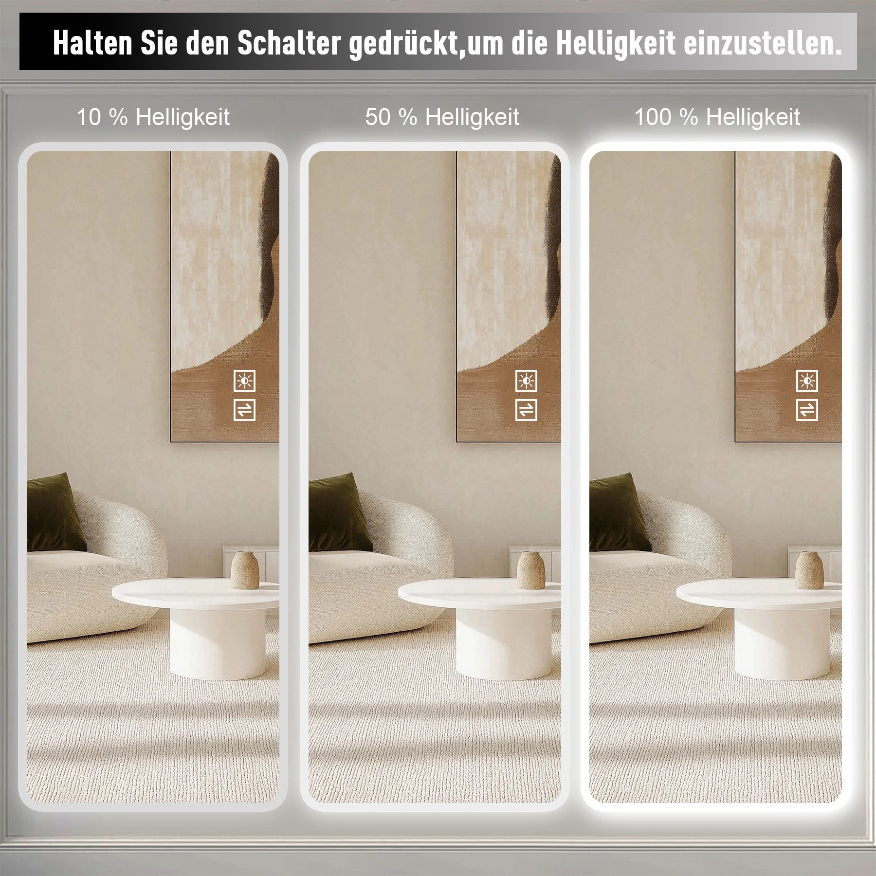The mirror features controls for turning the light on and dimming. Two buttons allow adjustment: one controls light brightness, and the other switches the light color. A long press on the switch activates brightness adjustment mode, smoothly transitioning from 10% night light to 100% full brightness. Constant current drive technology prevents flicker and eye strain, ensuring smooth brightness changes similar to natural light. A 50% brightness memory setting intelligently adapts to frequent daily use. Quickly pressing the dimming button switches between different color temperature lights.