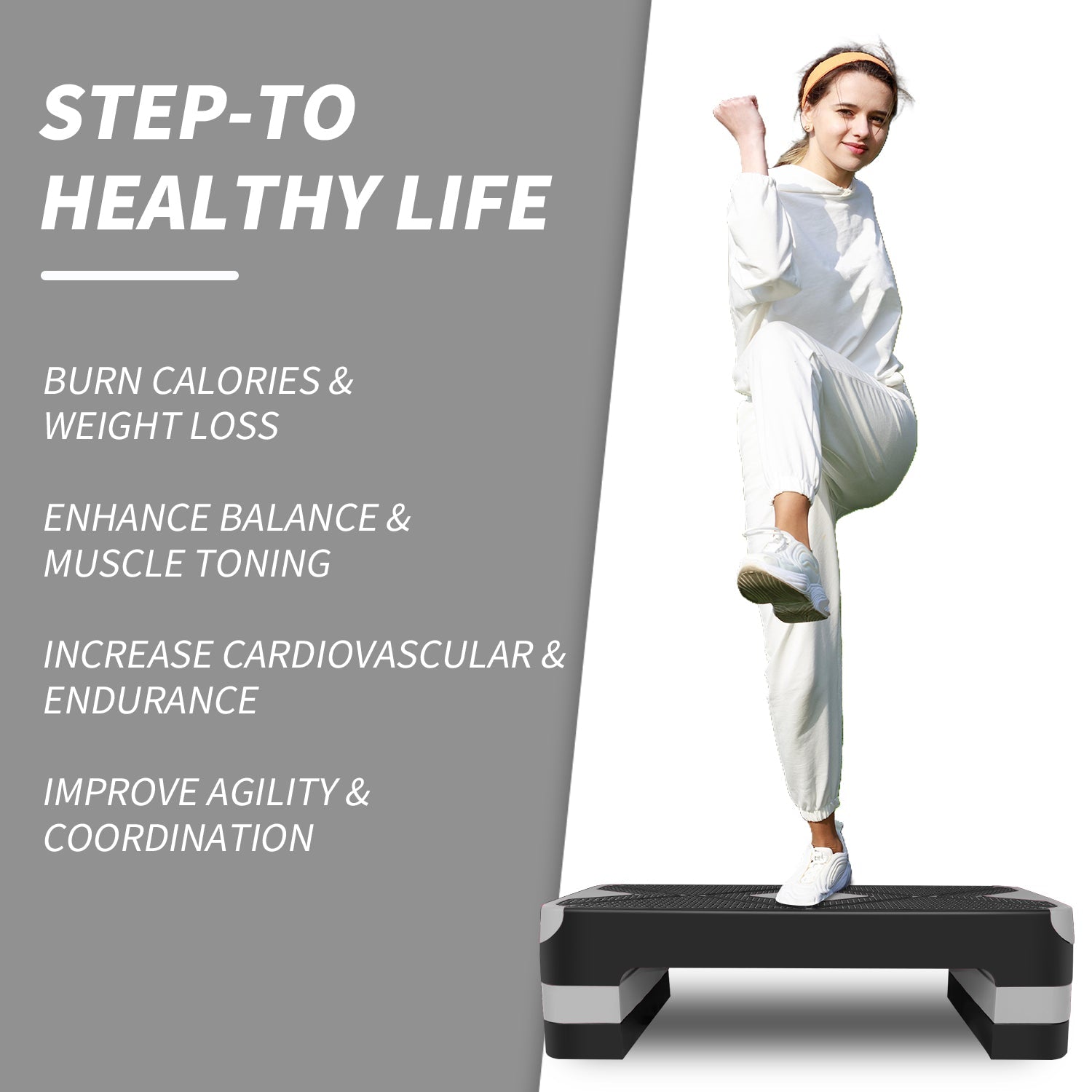 This stepper is perfect for aerobic workouts, cardio, and HIIT. You can perform planks, burpee jumps, crossovers, knee ups, push-ups, sit-ups, and more to boost your muscle, burn calories, lose weight, and improve cardiovascular health. The step deck is great for workout classes, recovering from an injury, or everyday regular workout routines at home.