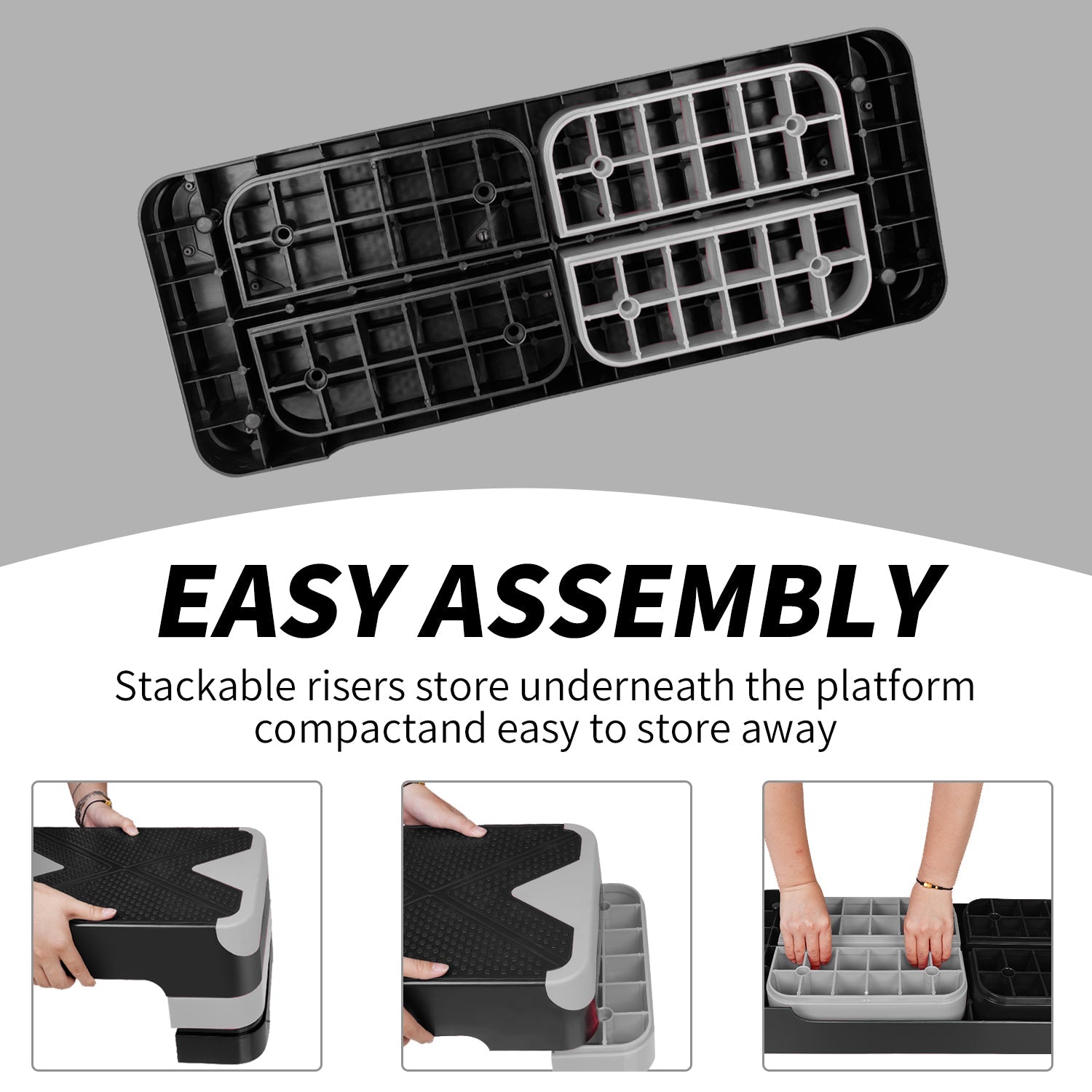 The textured surface is non-slip and shock absorbing, which means you can have stability with every single set of steps. This workout stepper comes with non-skid rubber feet on each riser to prevent sliding or slipping, provide stable performance, and leave no scratches.