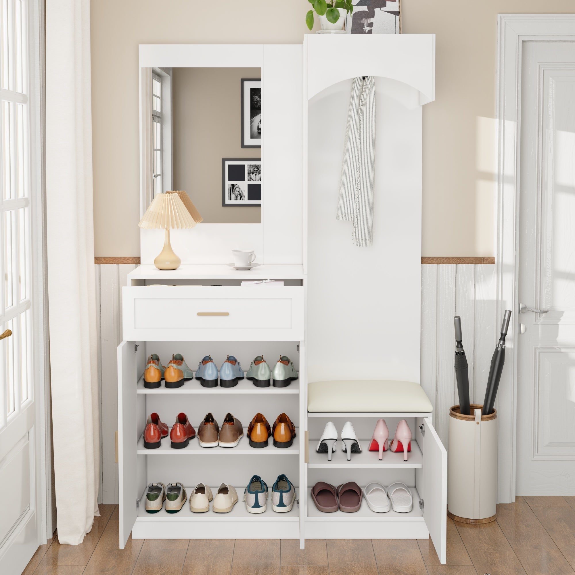 2. This combination of wardrobe, shoe cabinet, mirror, and shoe bench is versatile and practical.