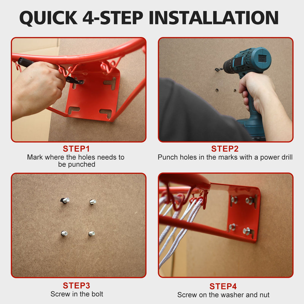 This wall-mounted basketball hoop is easy to install and does not require professional installers. Simply follow these four steps: First, mark the positions of the four installation holes. Second, drill holes using nails or a drill. Third, screw in the expansion bolts into the holes. Fourth, install the basketball hoop. Assembly takes just a few minutes.