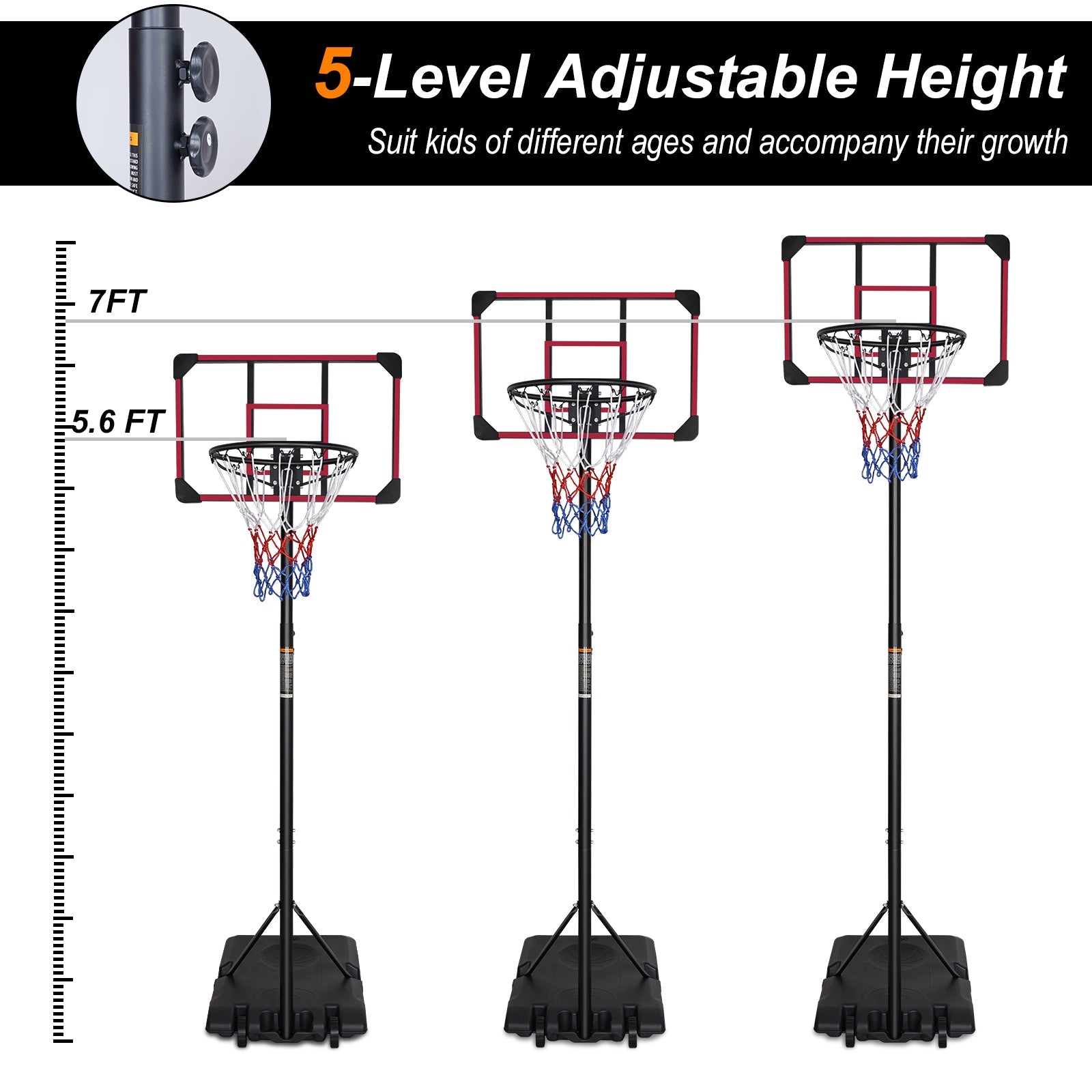 Portable Basketball Hoop, Adjustable Height 5.6-7FT, Indoor/Outdoor, Red