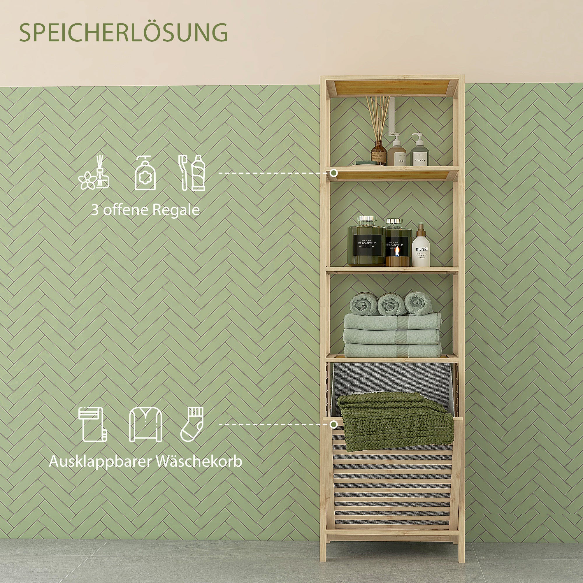 This tall bathroom shelf offers a versatile storage solution with three open shelves and a unique tilting laundry hamper featuring a fabric lining, combining both functionality and style for your bathroom.