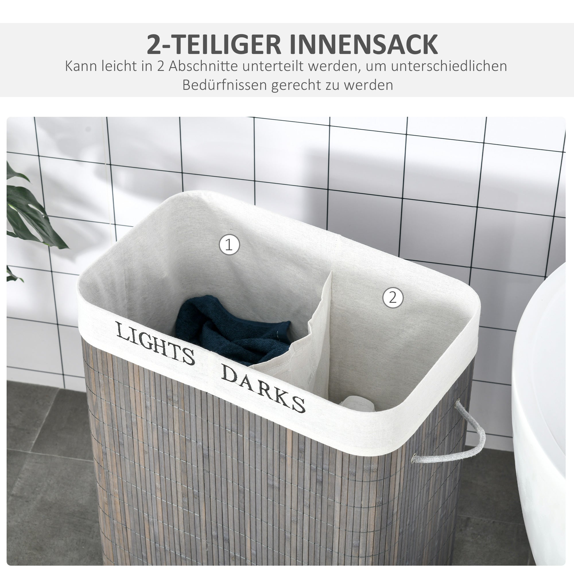 Laundry Basket 100L 2 Compartments Foldable Bamboo, Grey