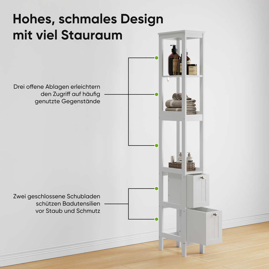 Narrow Tall Cabinet, Freestanding with 2 Drawers and 3 Shelves, White