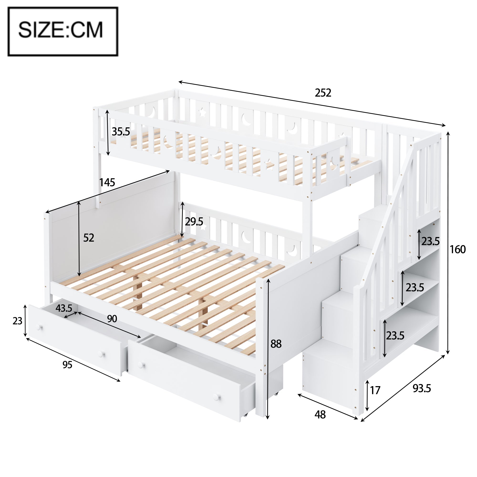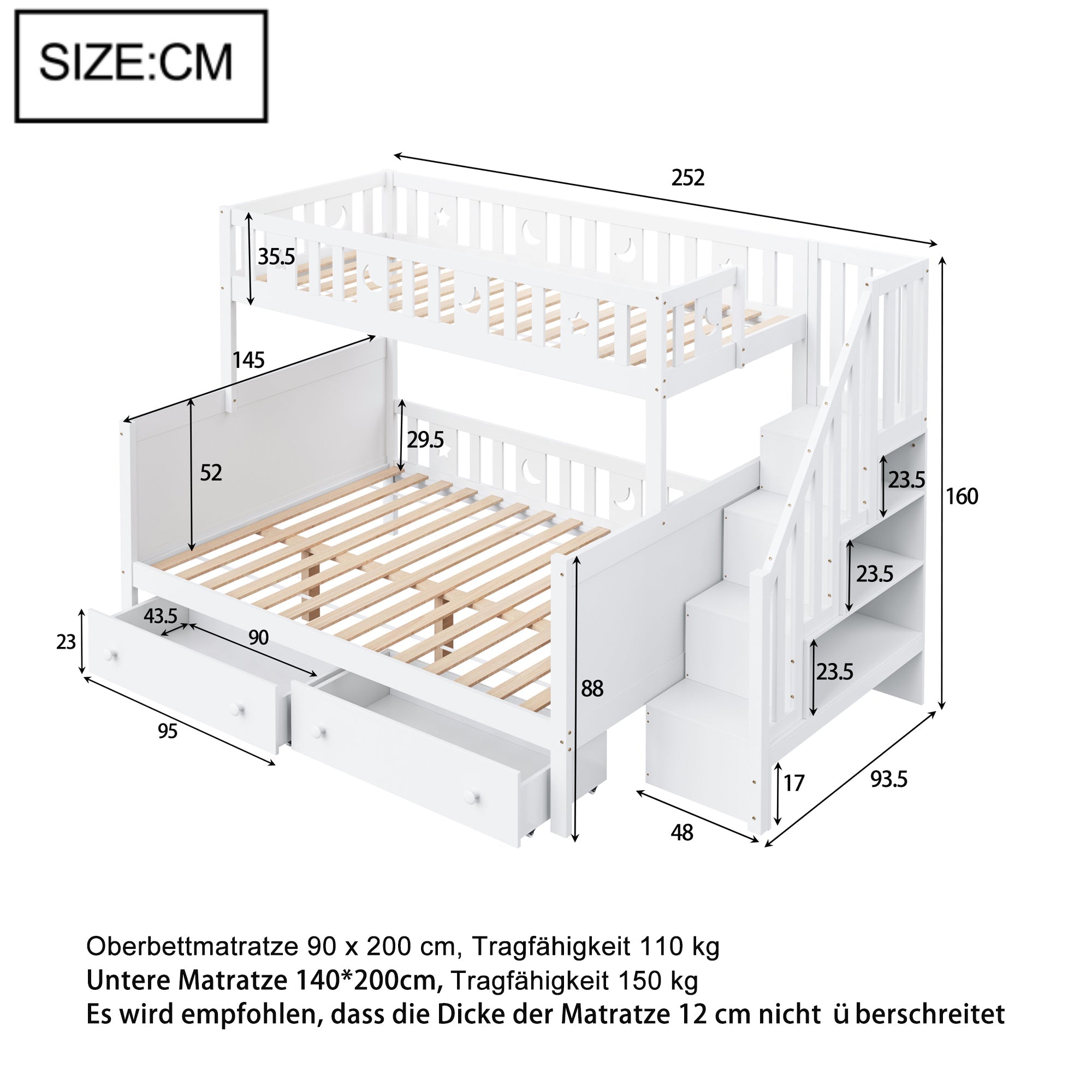 Children's Bunk Bed 90*200/140*200cm Safety Stairs Drawers Slatted Base, Solid Wood White