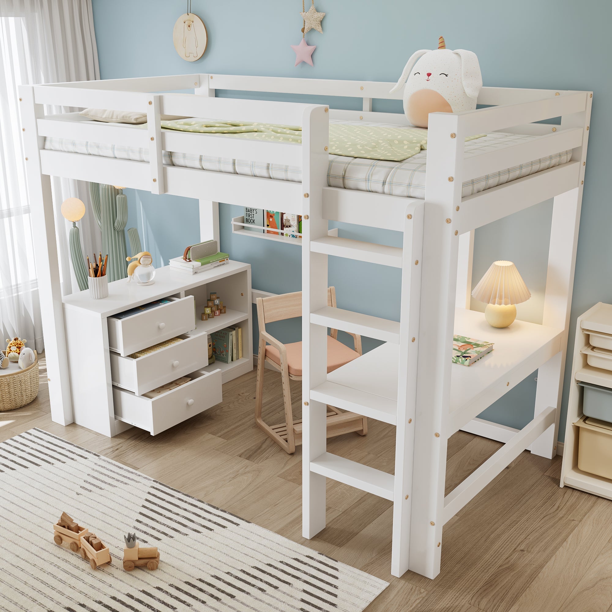 Loft Bed, Children's Bed, with Desk, Drawer Unit, and Storage Shelf, White, 90x200cm