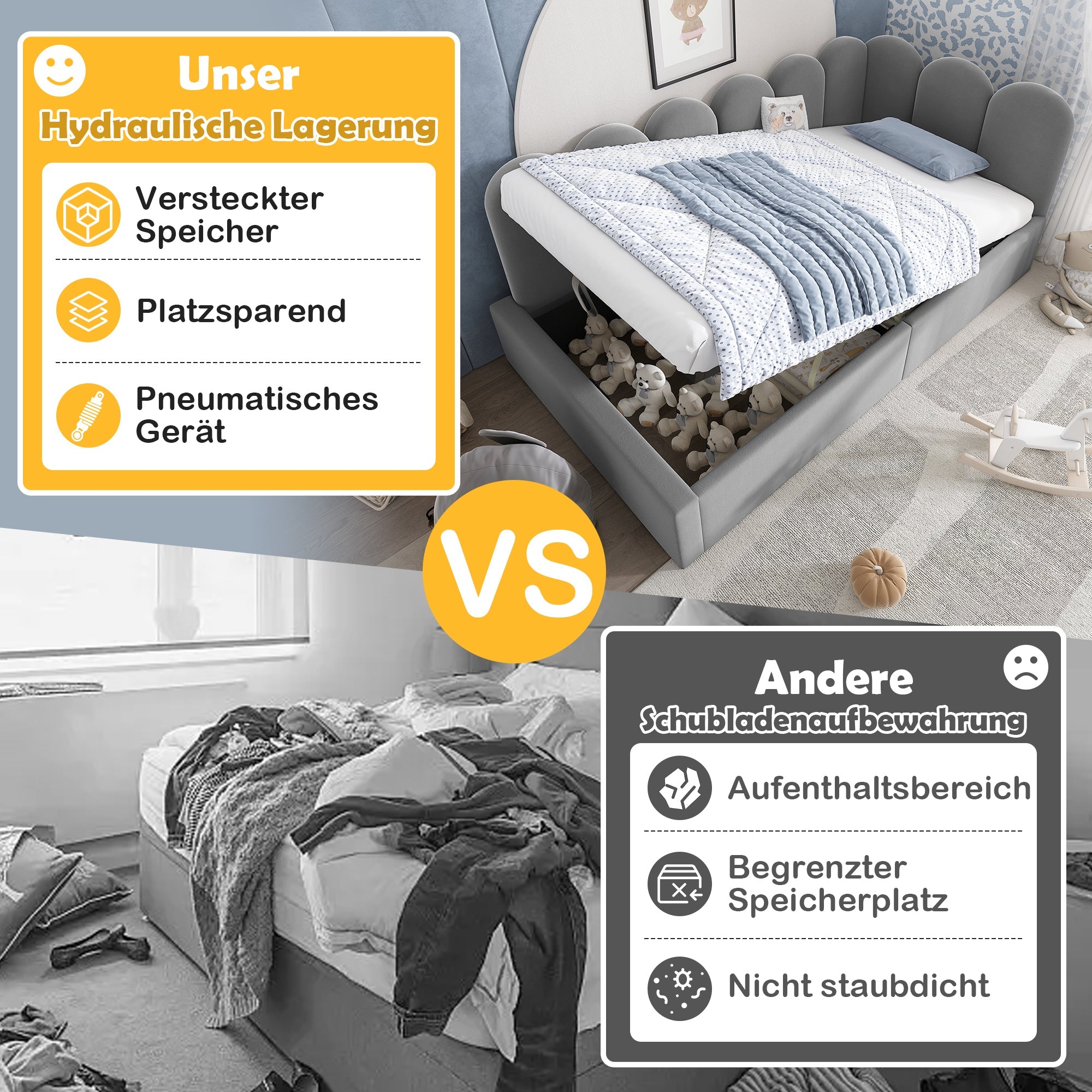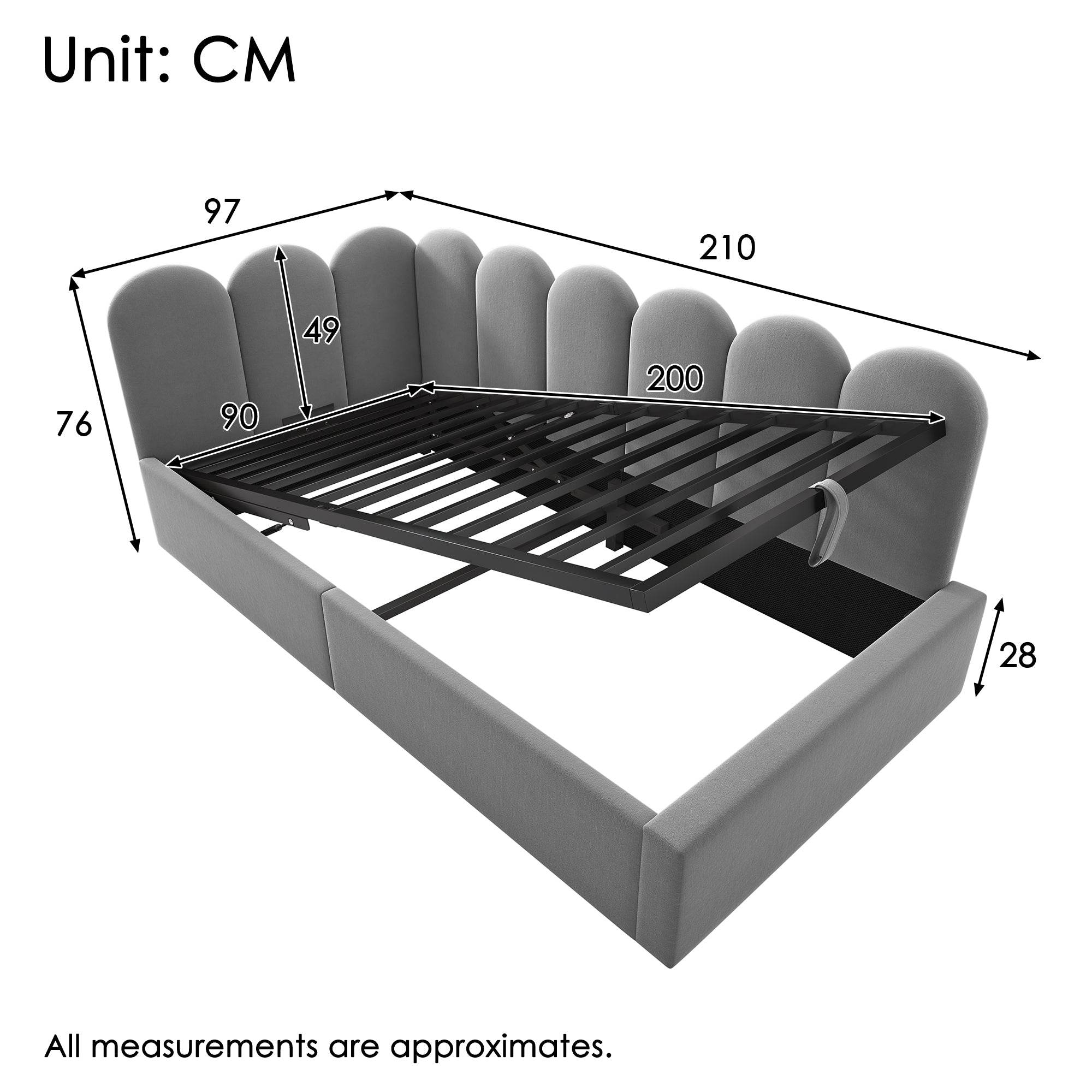Daybed Sofa Bed 90x200cm Hydraulic Storage Metal Slatted Base, Velvet Grey