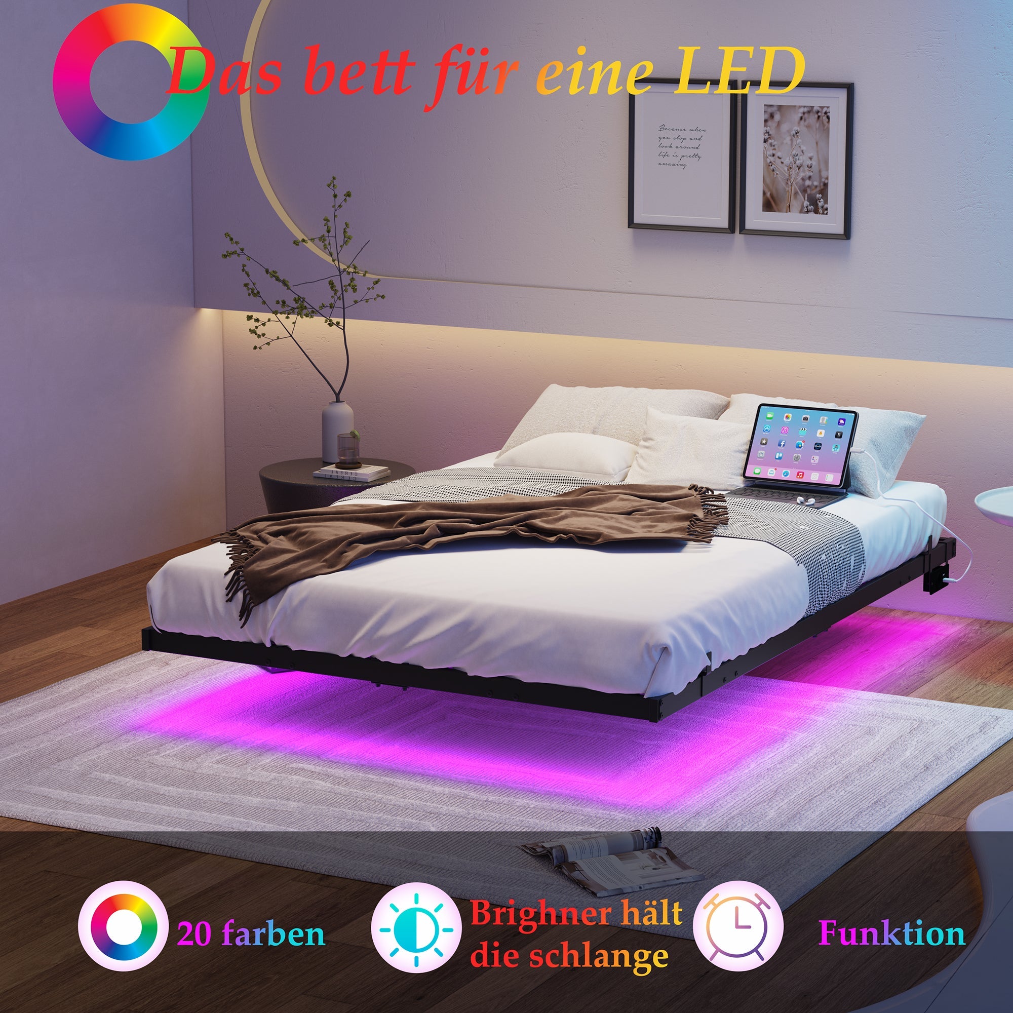 Floating Bed Frame 140x200cm LED Charging Slatted Base, Metal Black