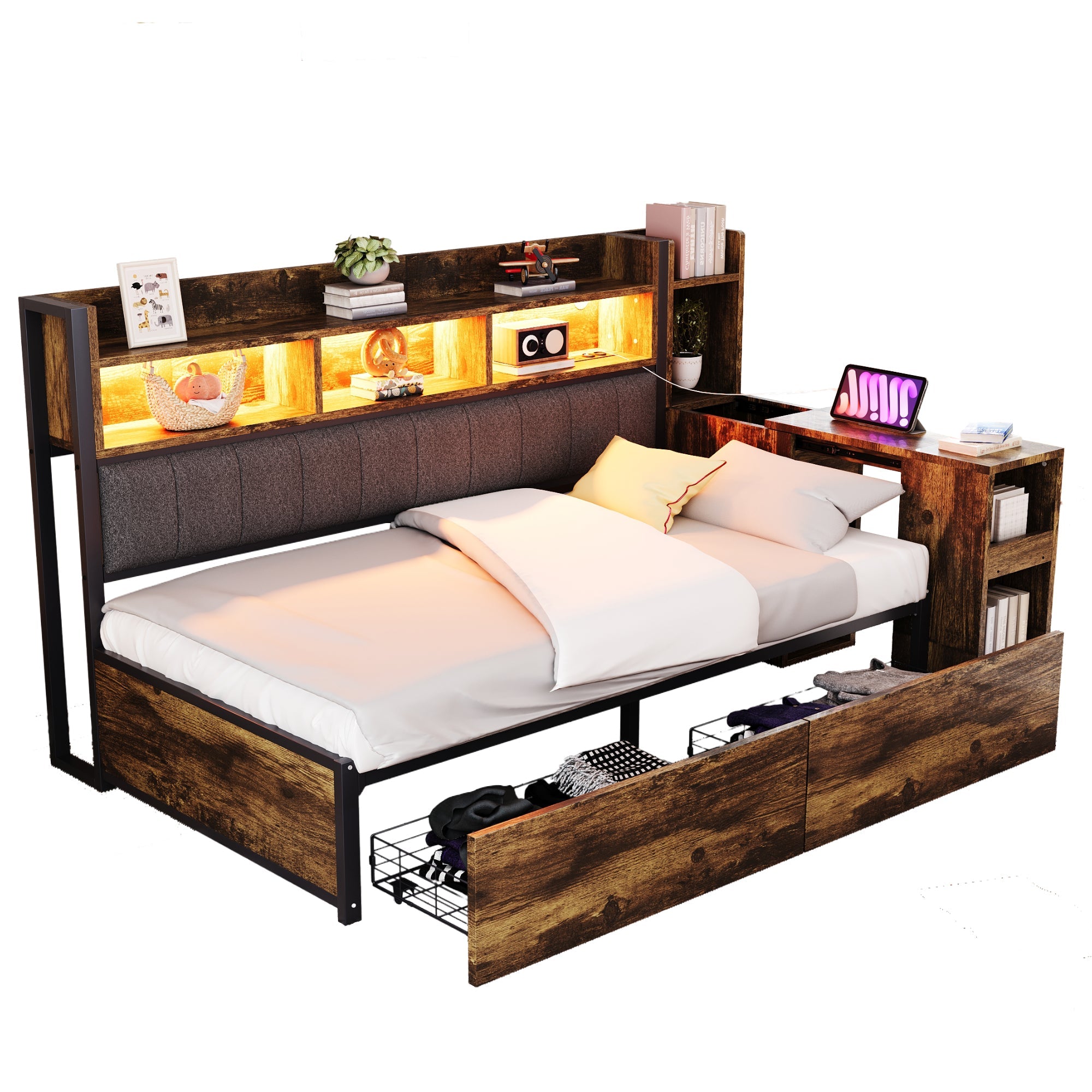 Iron Sofa Bed 90x200cm, Storage, Desk, LED/Sockets - Wood Color