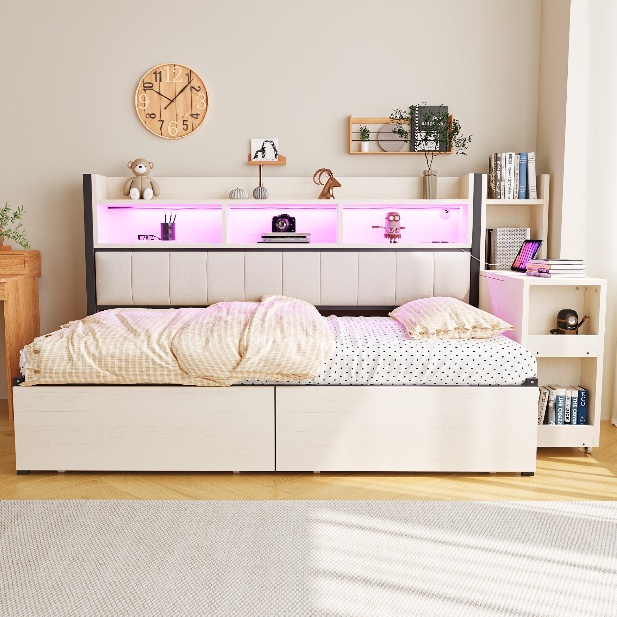 This single bed features multiple storage compartments where customers can store toys, books, decorative items, and other belongings. Two large drawers under the bed provide additional space for bedding, clothing, and other essentials.