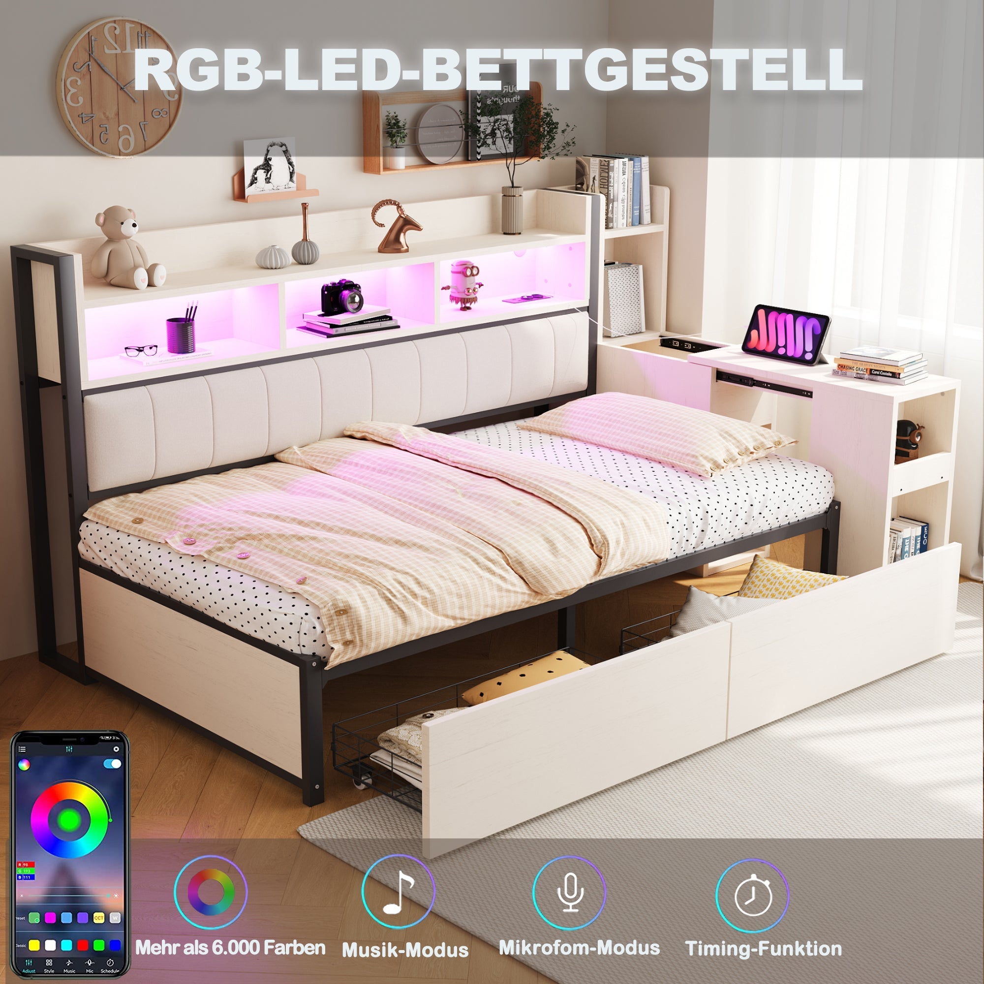 Iron Sofa Bed 90x200cm Storage Drawers Desk LED White
