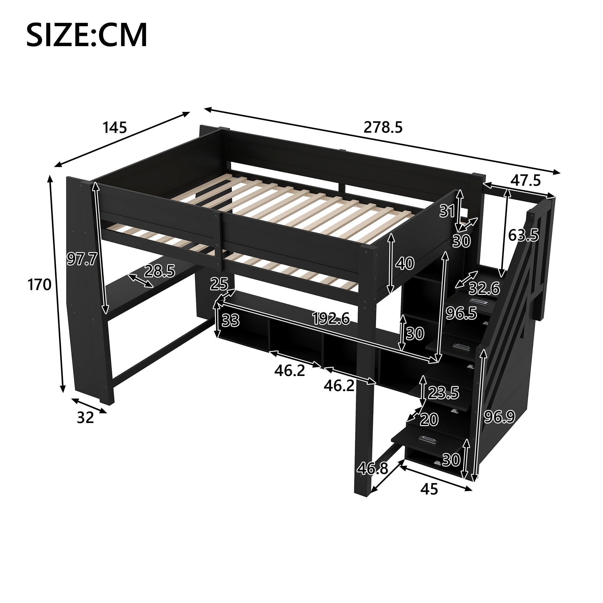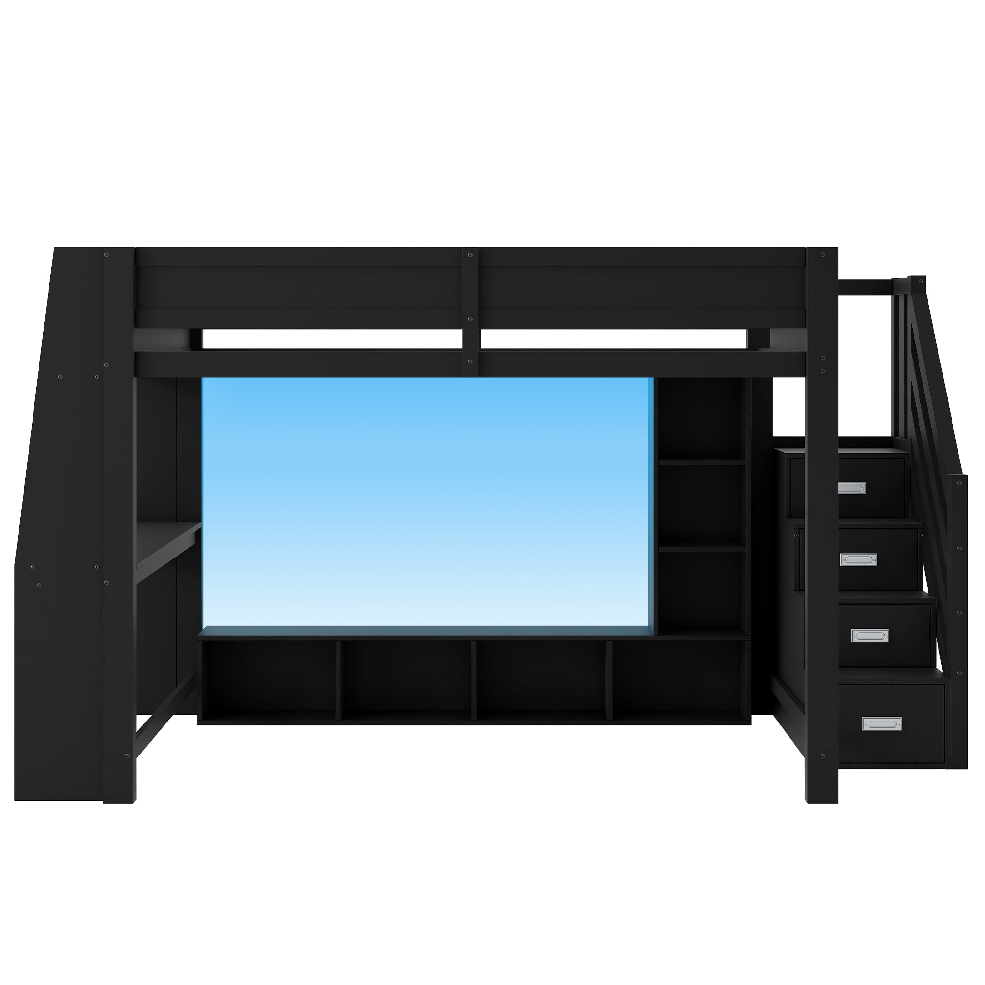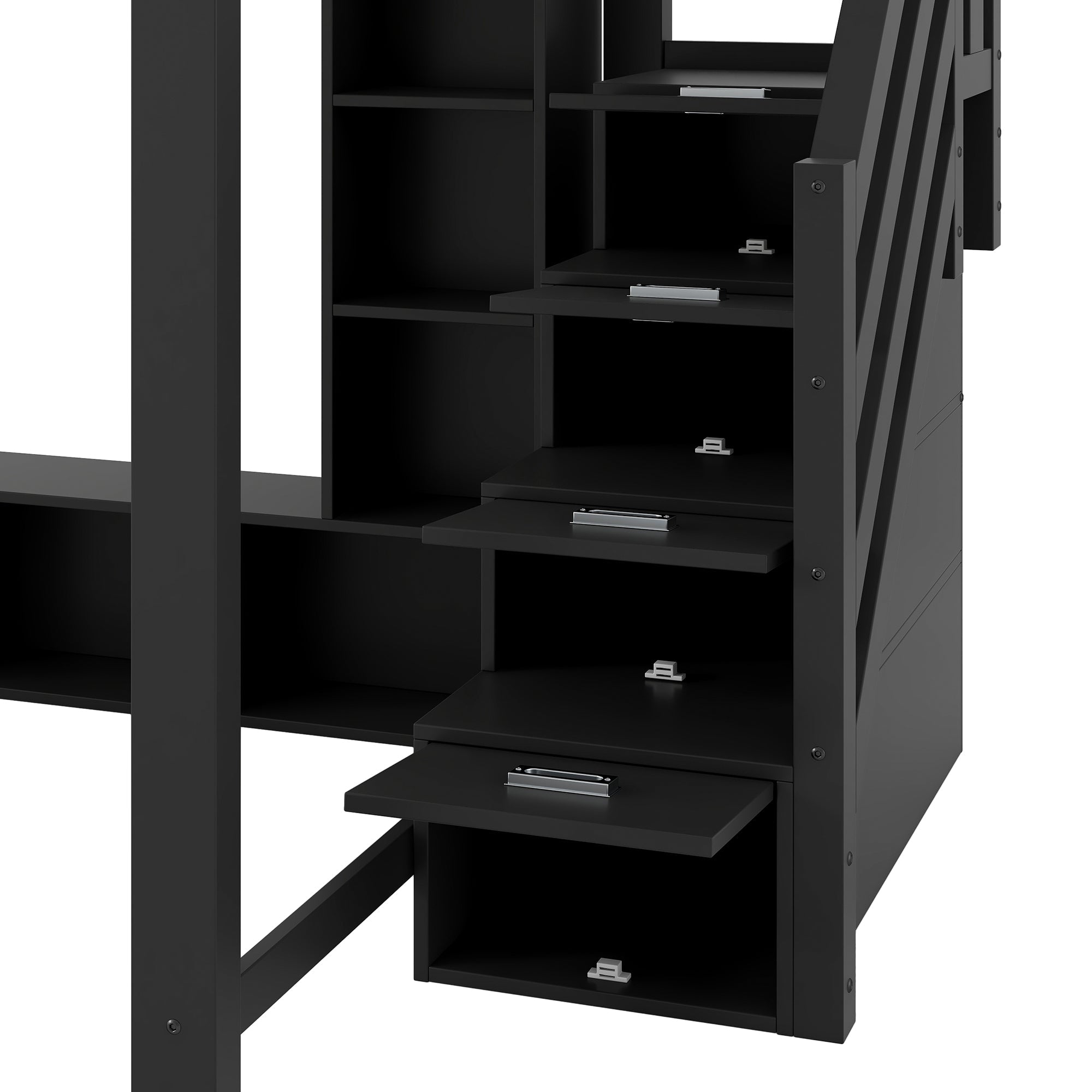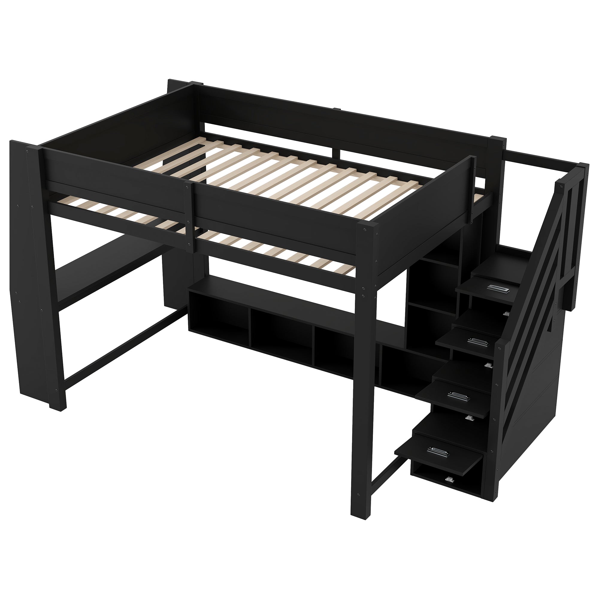 Loft Bed 140x200 with Desk, Storage, LED Lighting, Stairs - Wooden/Black
