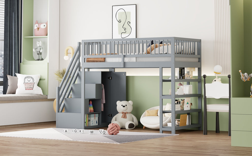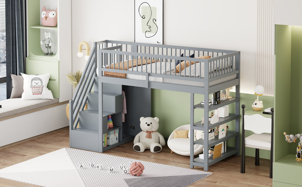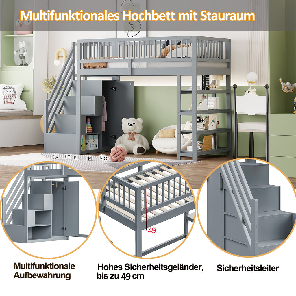 Loft Bed with Wardrobe, Shelves, Storage, Ladder, 90 x 200, Solid Wood, Grey