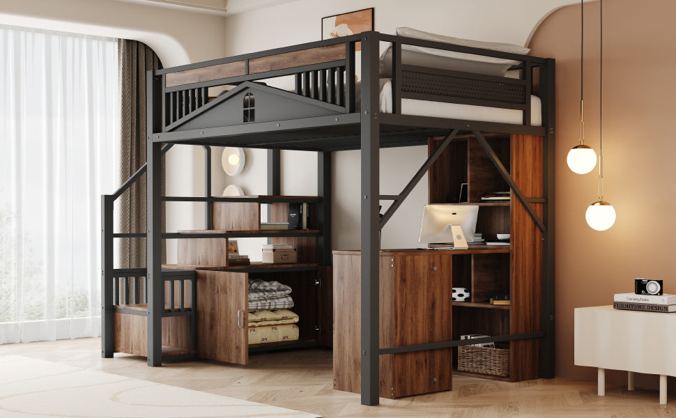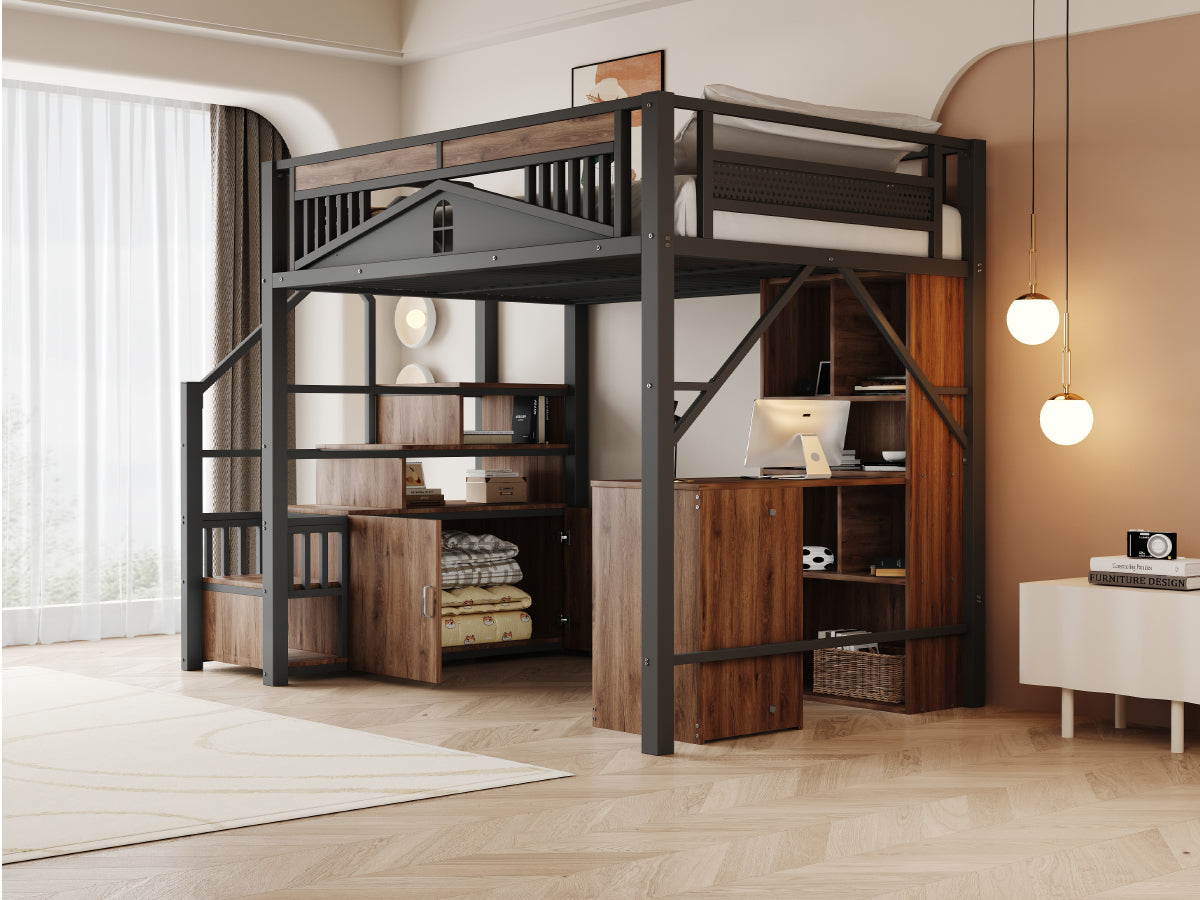The raised structure of this loft bed provides ample space underneath, allowing you to create separate areas for your child to study, play, or relax. It also features safety stairs on both sides for secure access. Each step includes built-in storage and a small cabinet for keeping essentials organized.