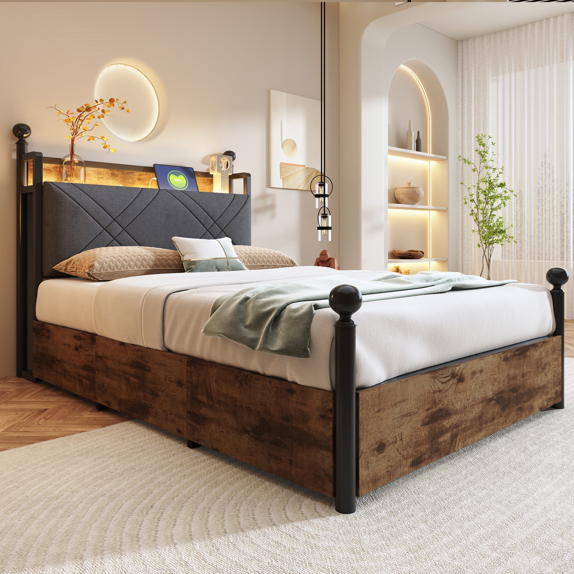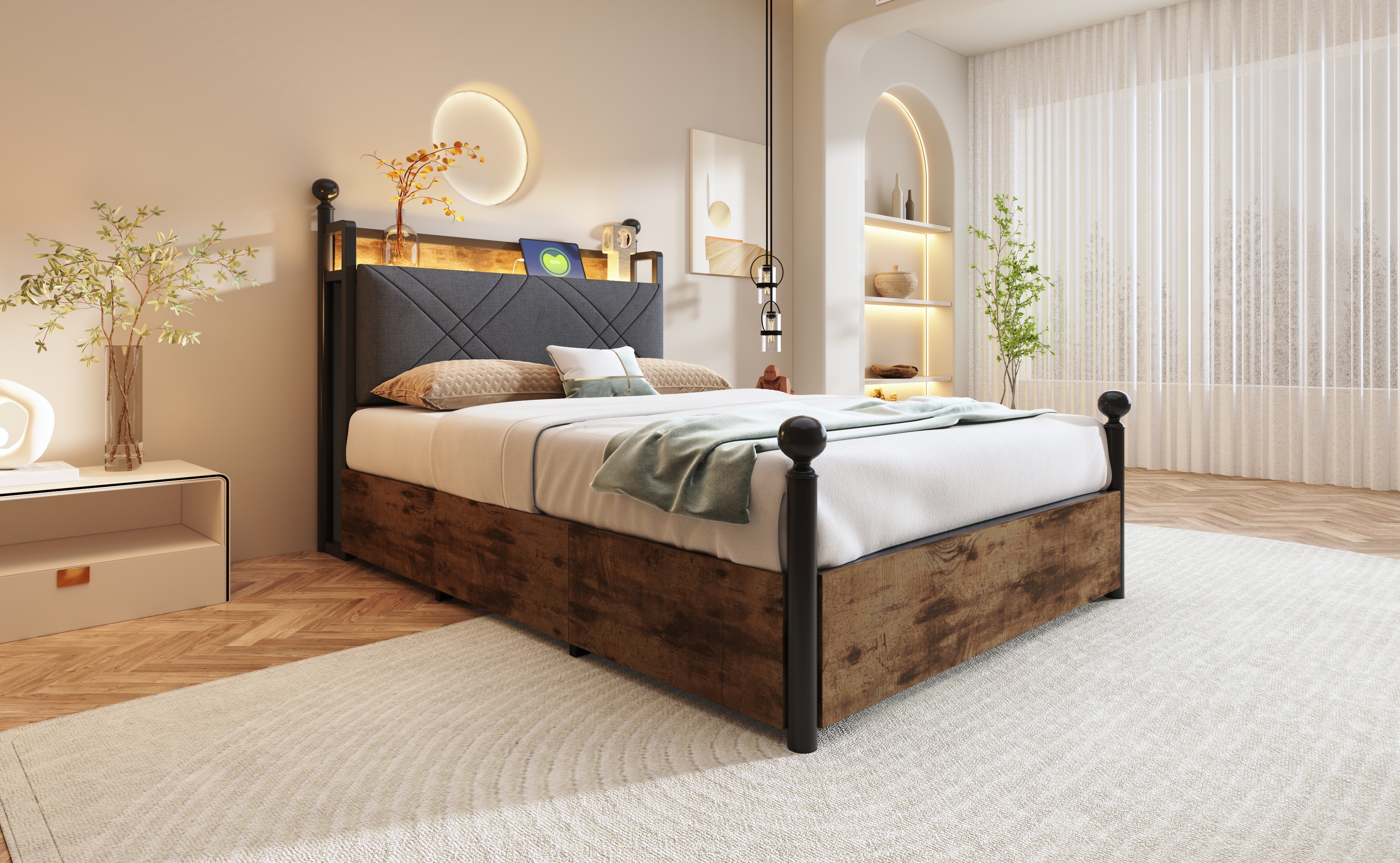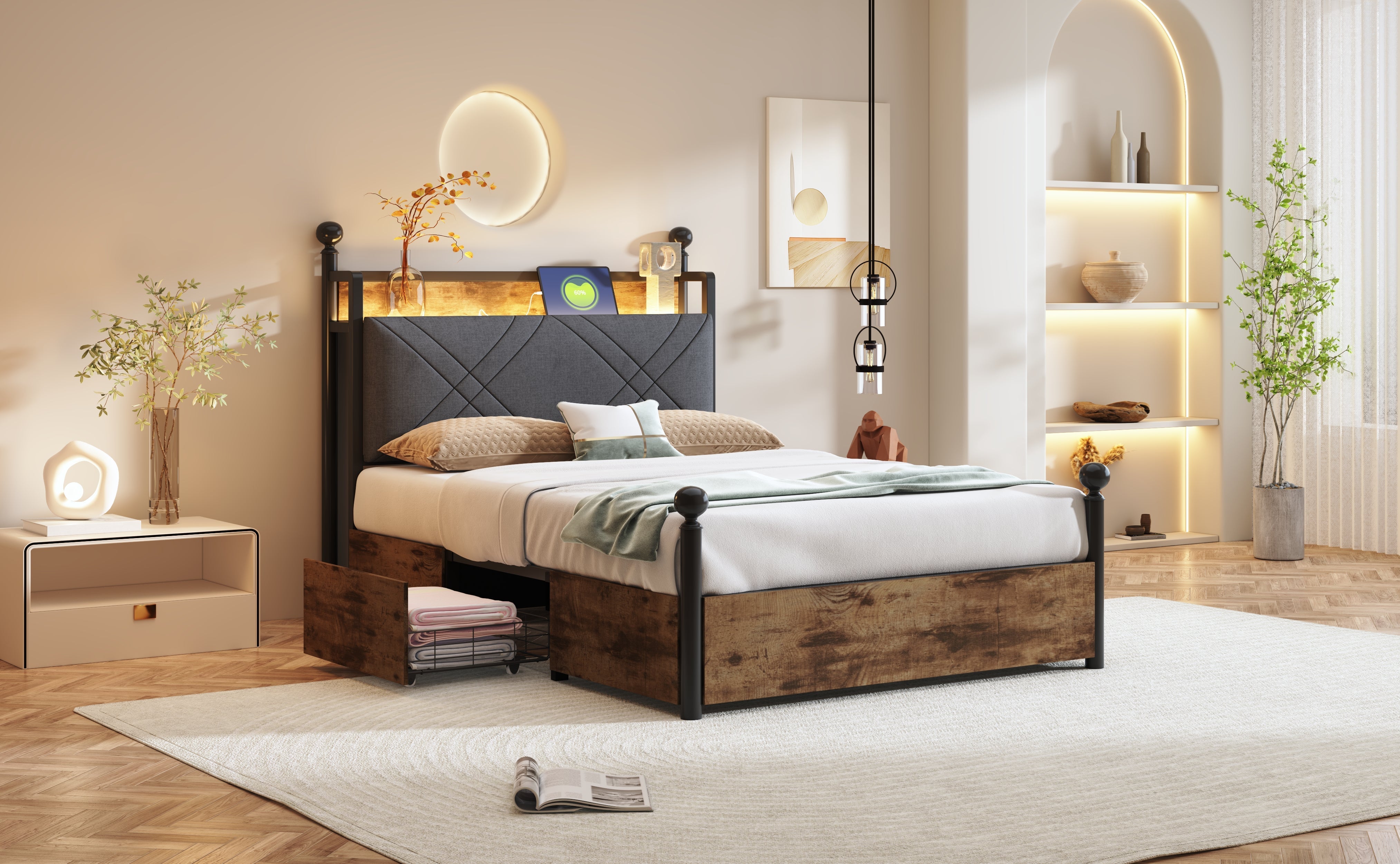 Ample storage space beneath the bed keeps your bedroom tidy, while the upholstered headboard provides ergonomic support for reading or relaxing. Integrated power outlets and USB/Type-C ports offer convenient charging, and the built-in smart LED strips allow you to personalize the ambiance with millions of colors, app and voice control, and timed lighting. With its elegant blend of black metal and natural wood panels, this bed offers both European-inspired luxury and practical functionality—perfect for compact apartments, children's rooms, or modern smart living spaces.