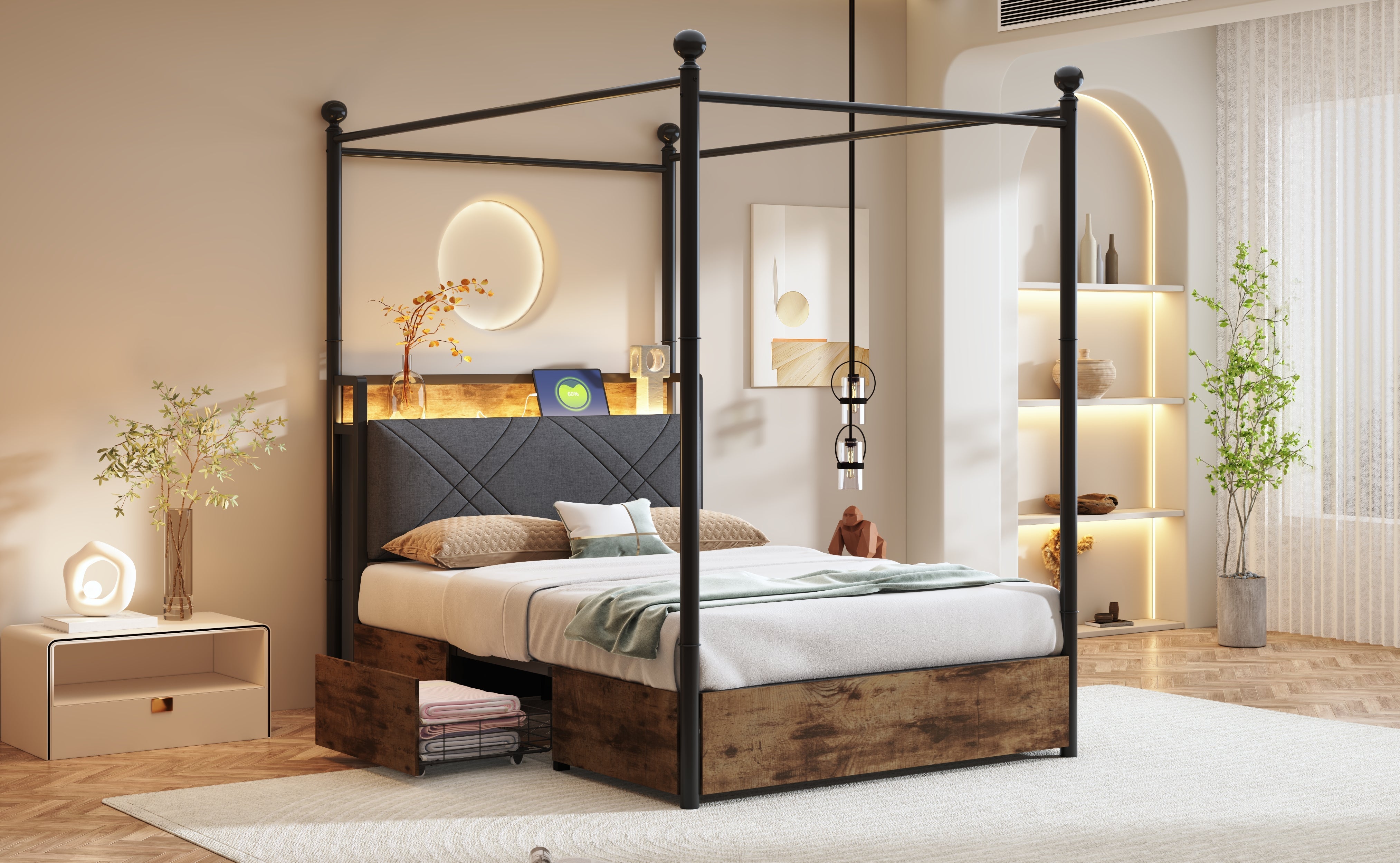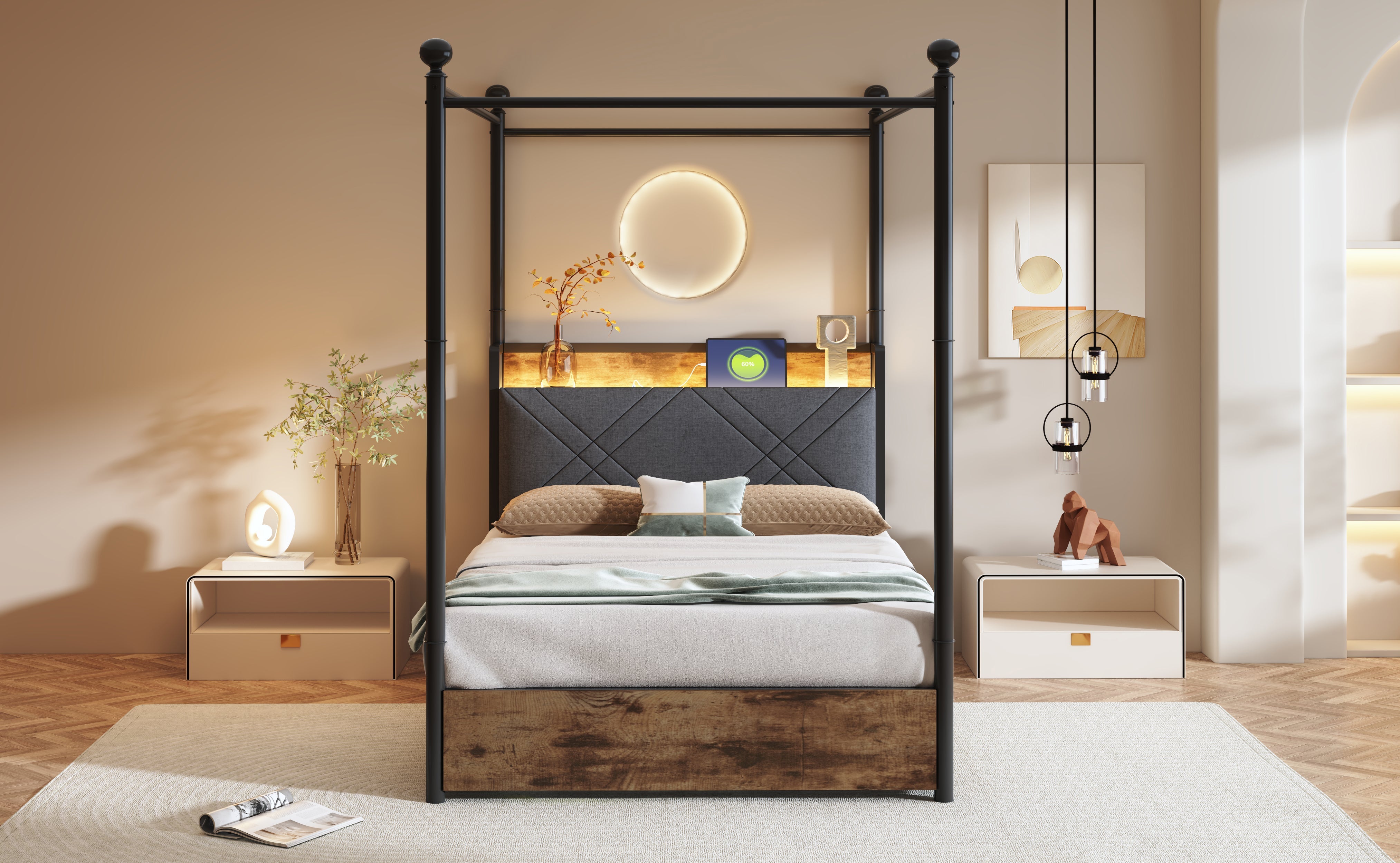 The multifunctional, European-style smart four-poster bed is a versatile and stylish solution that combines comfort, storage, and modern technology. The removable canopy frame easily transforms the bed from a cozy four-poster bed to a sleek, low-profile design, adapting to different room sizes and ceiling heights.
