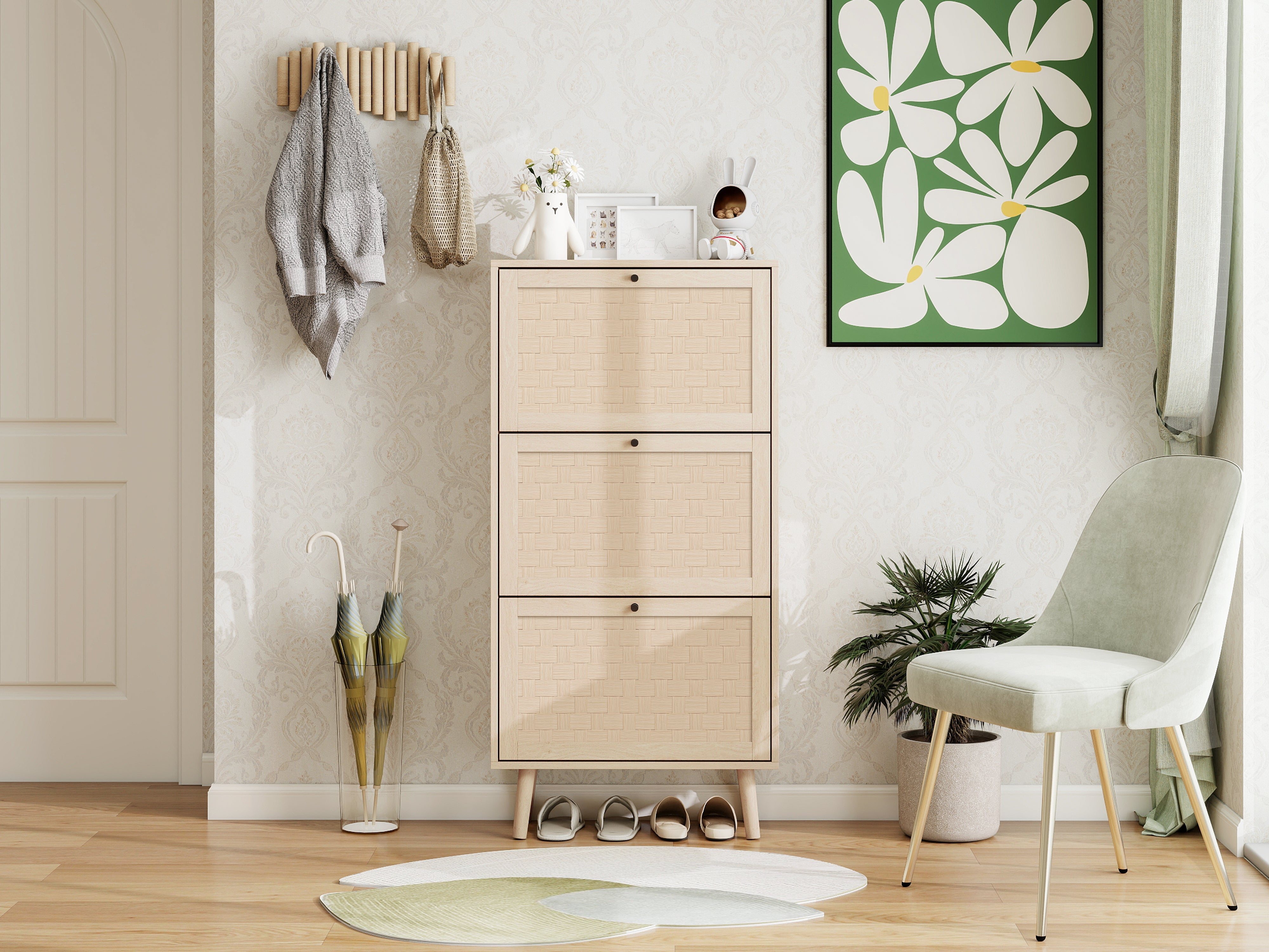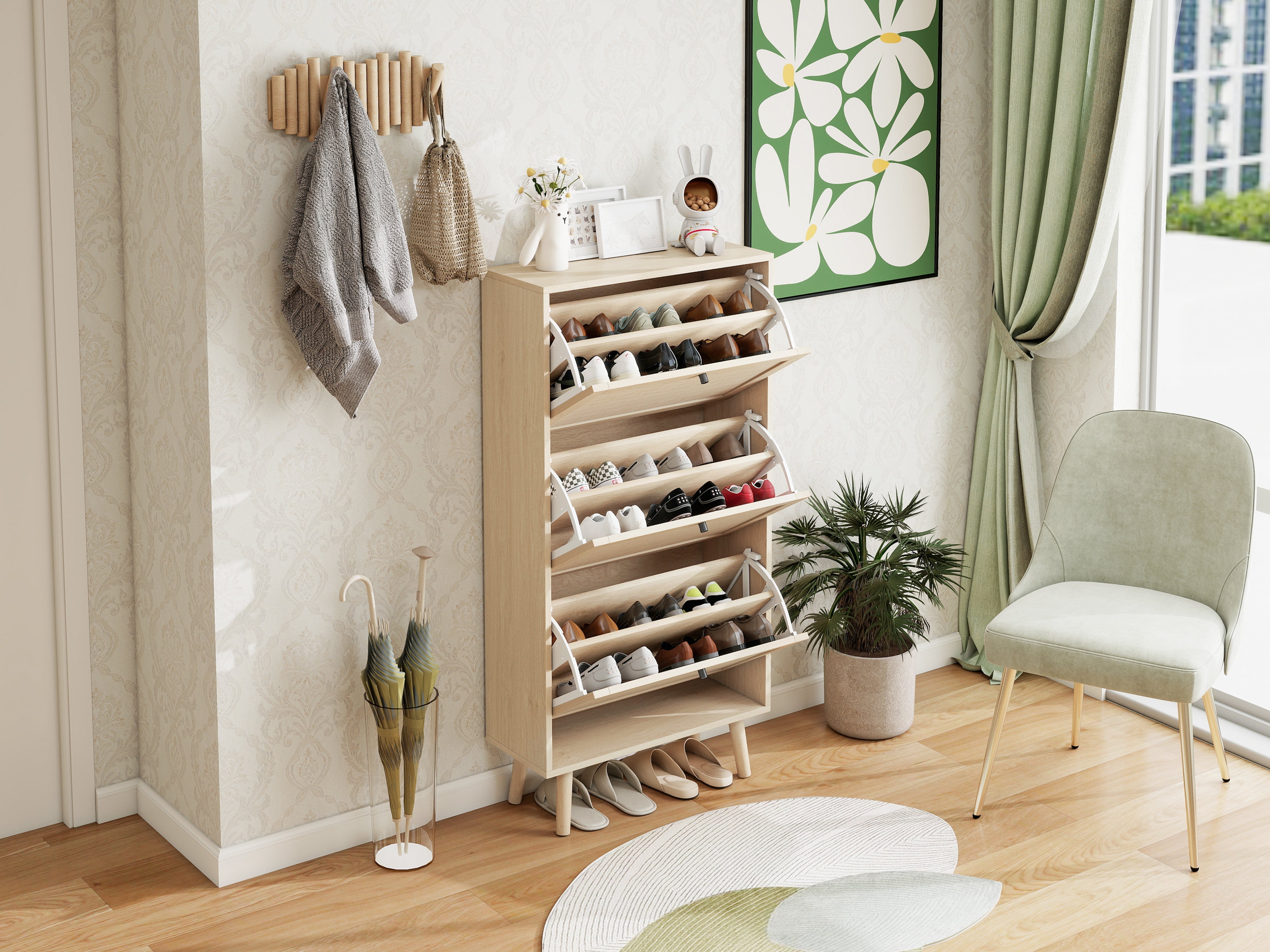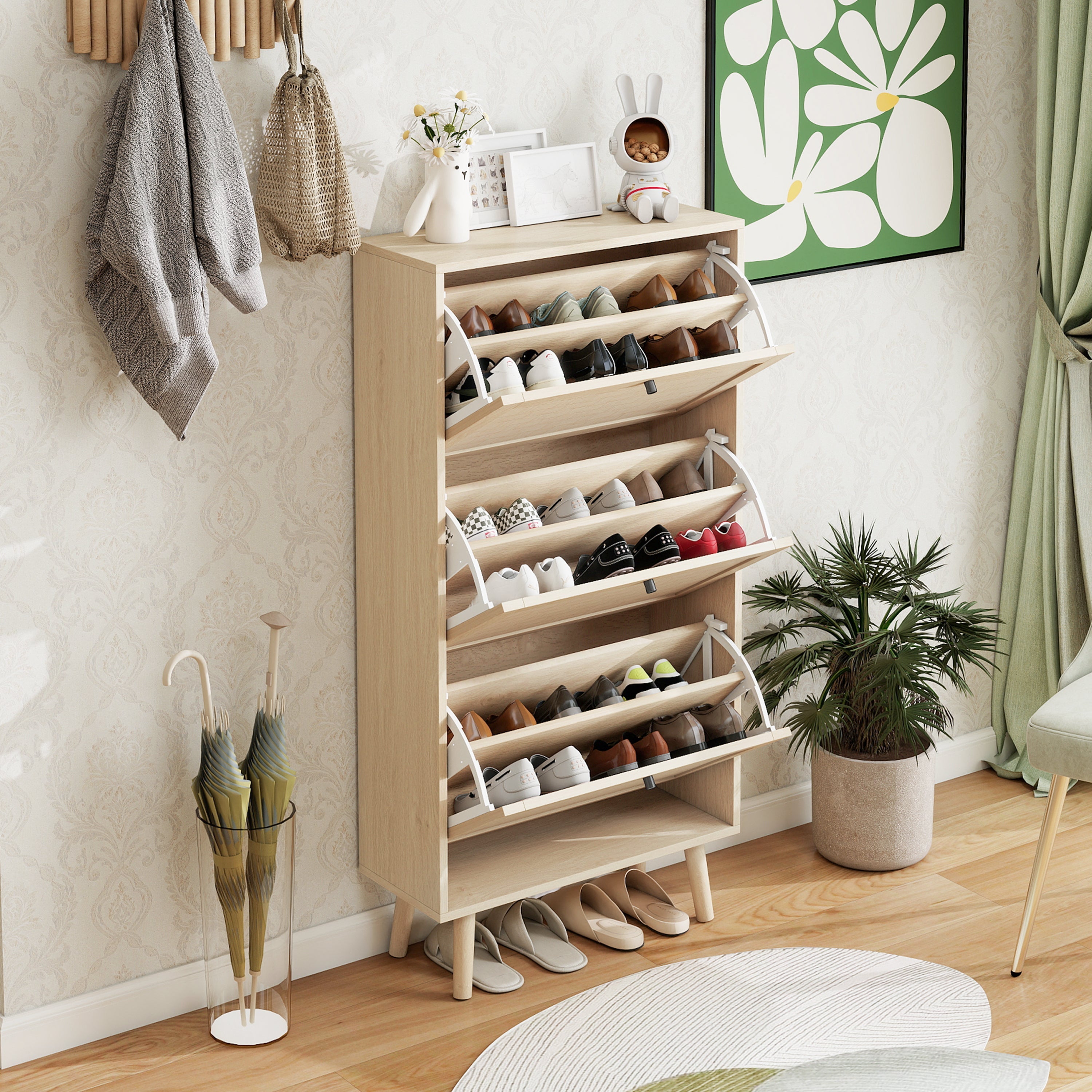Inside, the shoe cabinet includes a double-layered shoe rack. The middle partition is removable and flexibly adjustable, allowing you to accommodate larger shoes and offering greater storage versatility.