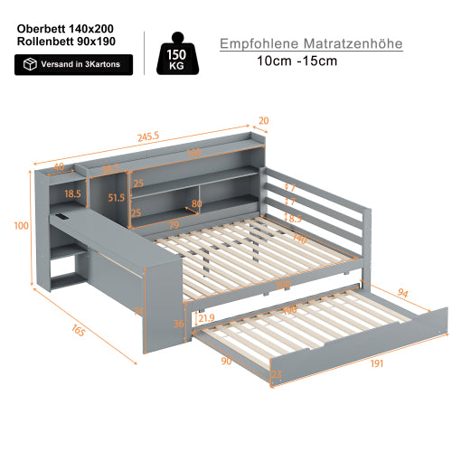 Sofa Bed, Multifunctional Double with Desk, Bookshelves, Power Outlets, Pull-out Bed, Solid Wood, Gray