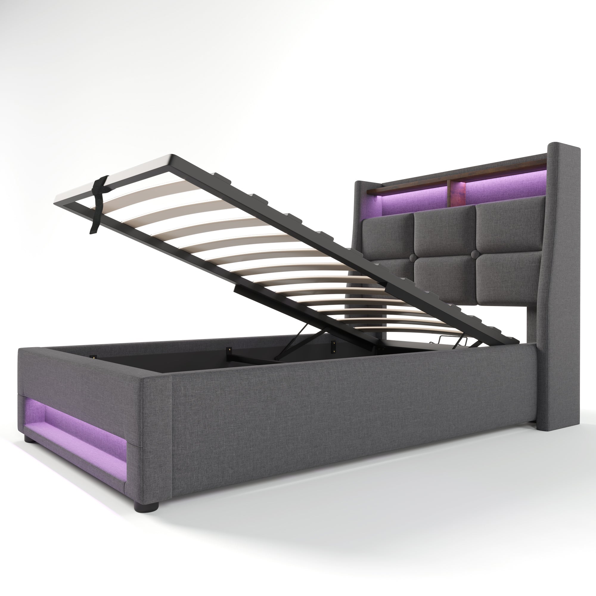 This unique LED bed includes 2 USB charging ports and features a linen panel material in Gray/Light Beige color. The overall dimensions are 95cm x 210cm x 117cm (Width x Length x Height), with a headboard spacing of 26cm. It does not require a box spring and assembly is required. The package contents include the bed frame, USB, and LED lights, delivered in 2 packages. The maximum user weight is 150 kg (330 lbs). The gross weight is 44.04 kg and the net weight is 41 kg.