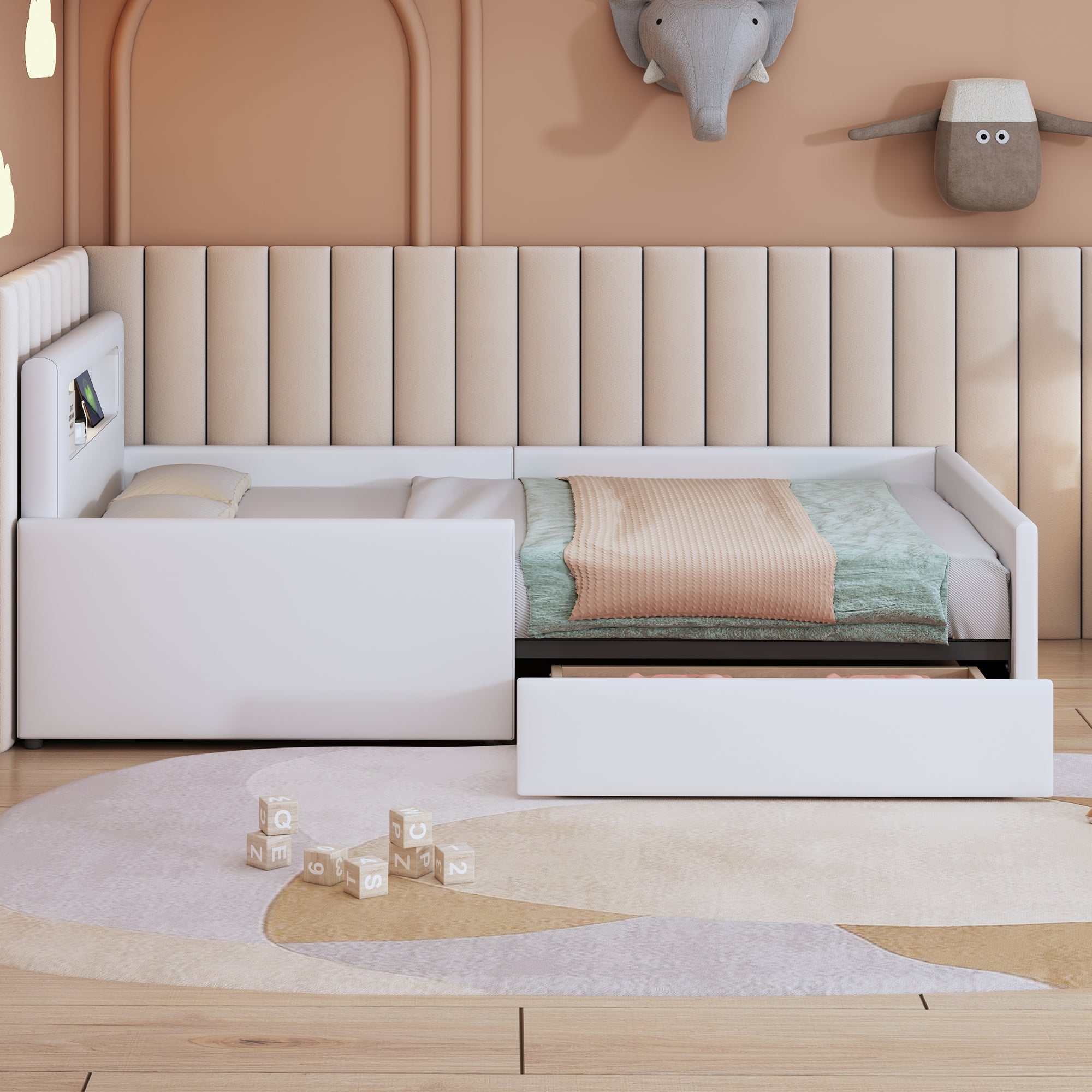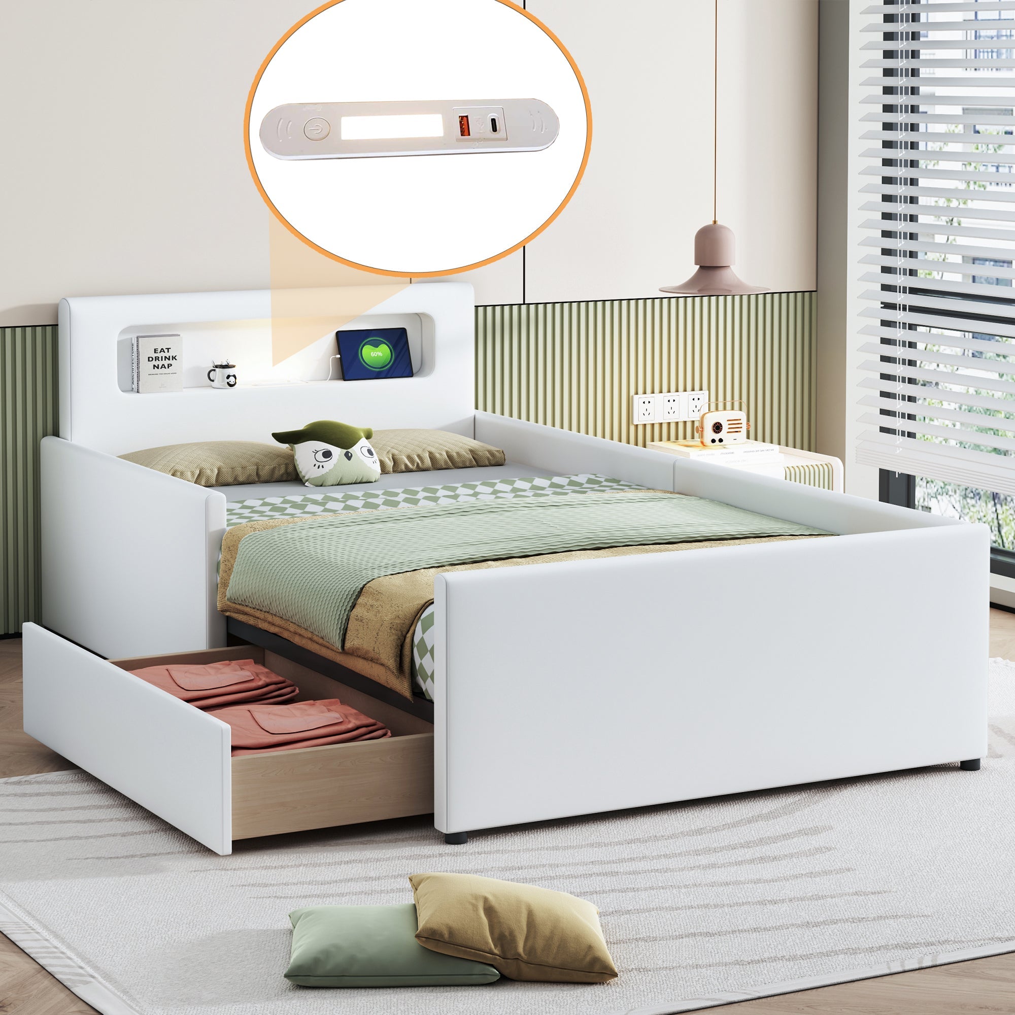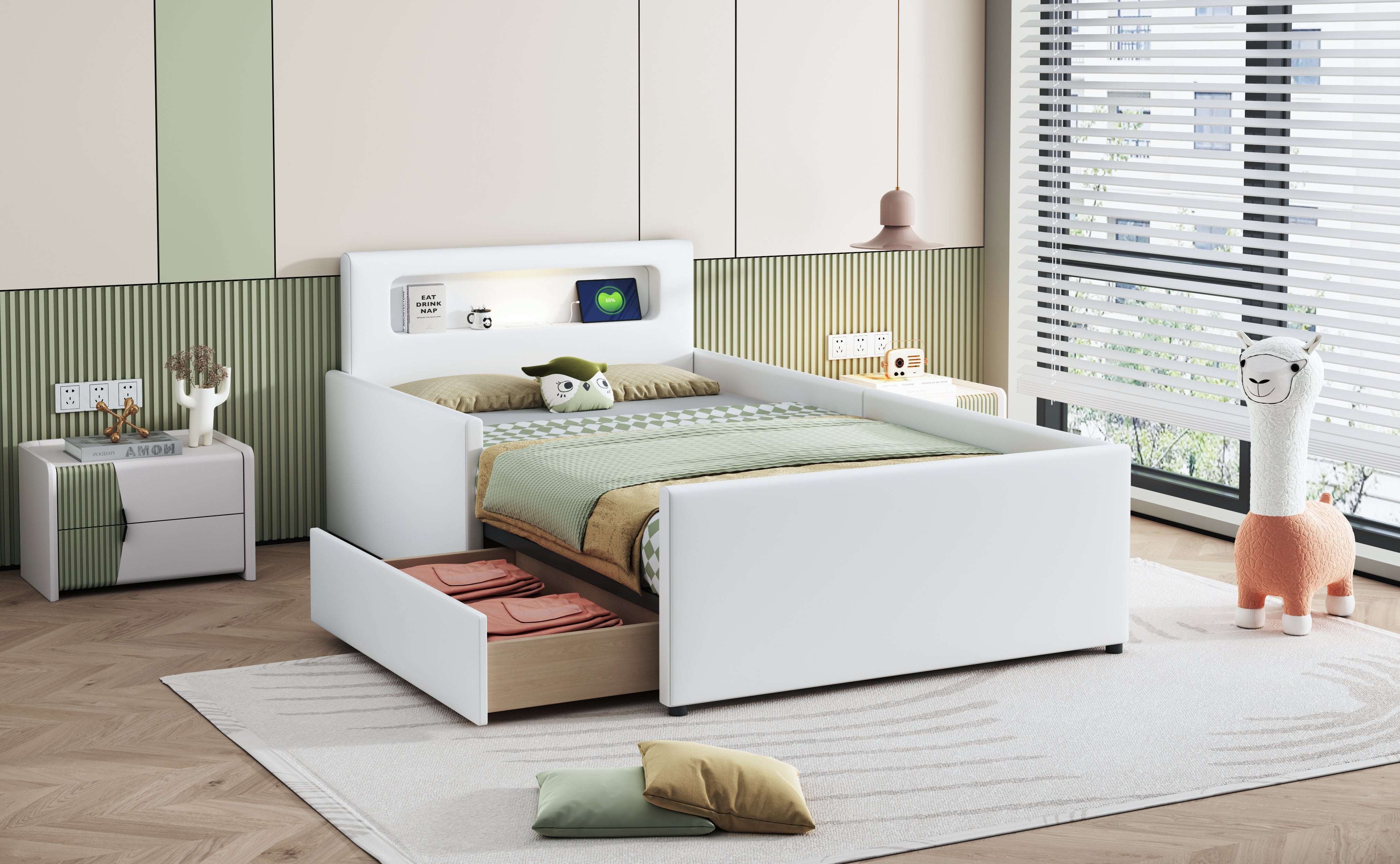 For safety, the bed has raised side rails on both sides, a thoughtful design that gives parents peace of mind and creates a secure space for their child. The headboard is equipped with a built-in nightlight that provides a soft, cozy glow, helping your child sleep peacefully. The bed also features spacious drawers for storing toys, clothes, or bedding, keeping the room tidy and organized. Additionally, the integrated USB fast-charging port allows for quick and convenient charging of electronic devices.