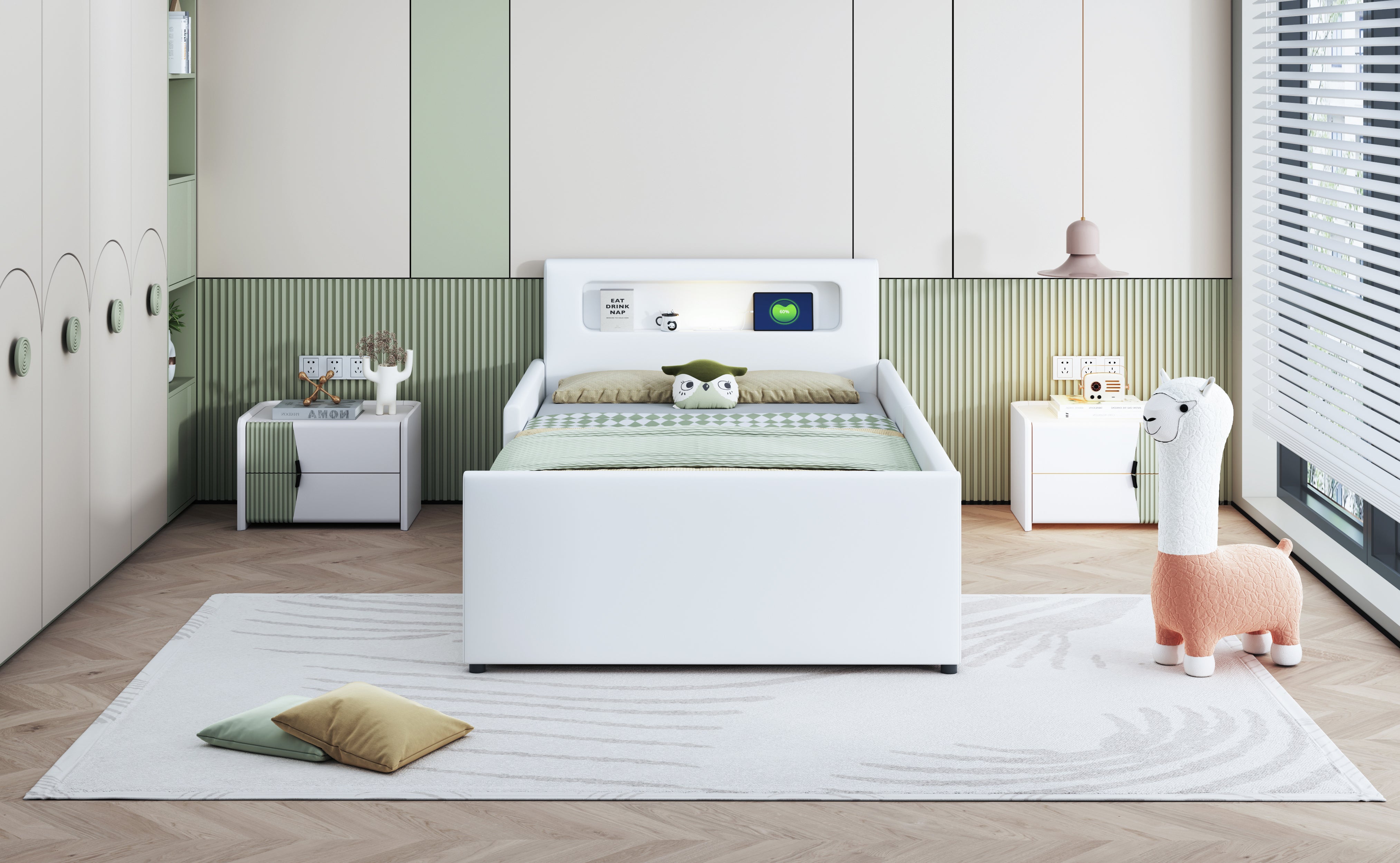 Upholstered Children's Bed 90x200cm Night Light USB Storage Faux Leather White