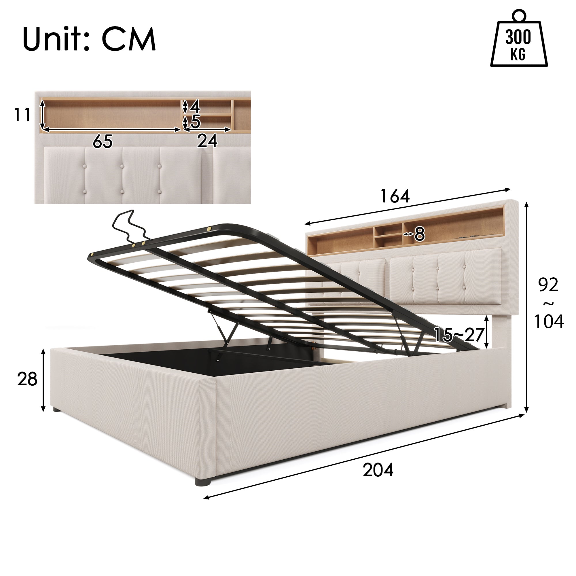 Upholstered Double Bed 160x200 USB-C Storage Headboard Linen Material
