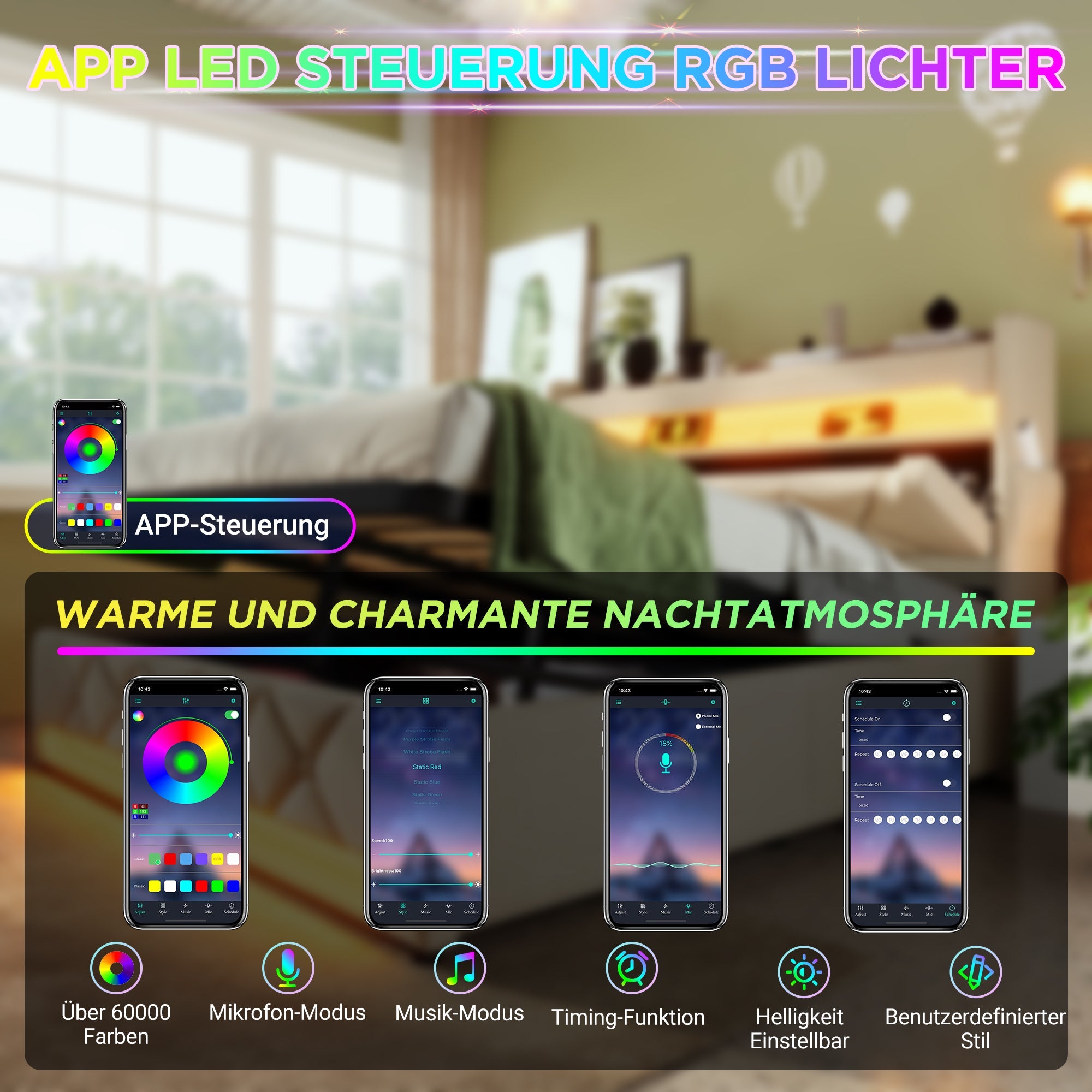 Upholstered Double Bed 180x200cm, Hydraulic Storage Headboard with LED/USB Ports, Beige Linen