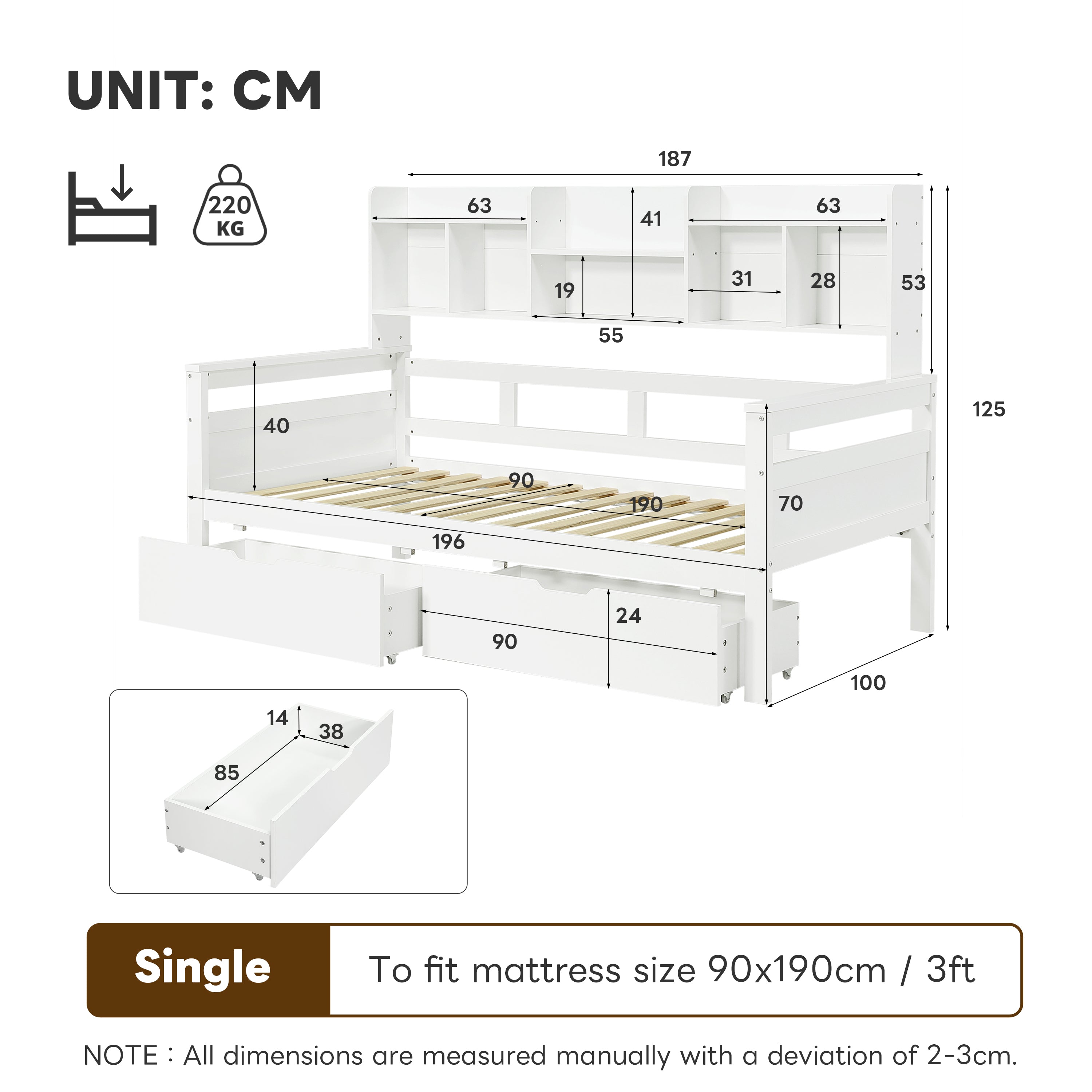 Enhance your space with our versatile and stylish single wooden drawer storage bed, ideal for modern homes. It combines functionality with sleek aesthetics. Two storage drawers and an integrated storage headboard make it easy to organize and access your belongings. The bookcase storage headboard is perfect for books, glasses, an alarm clock, a mobile phone, and other items. The drawers are also perfect for storing clothes, toys, or other household items. It is fitted with a semi-enclosed fence to provide reliable bedside protection. The white design offers a fresh, minimalist aesthetic that blends harmoniously with any decorative style in the bedroom, effortlessly creating an ideal space.