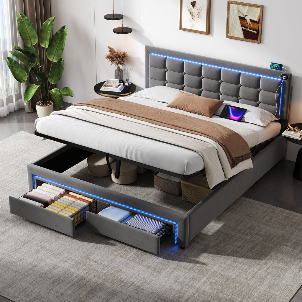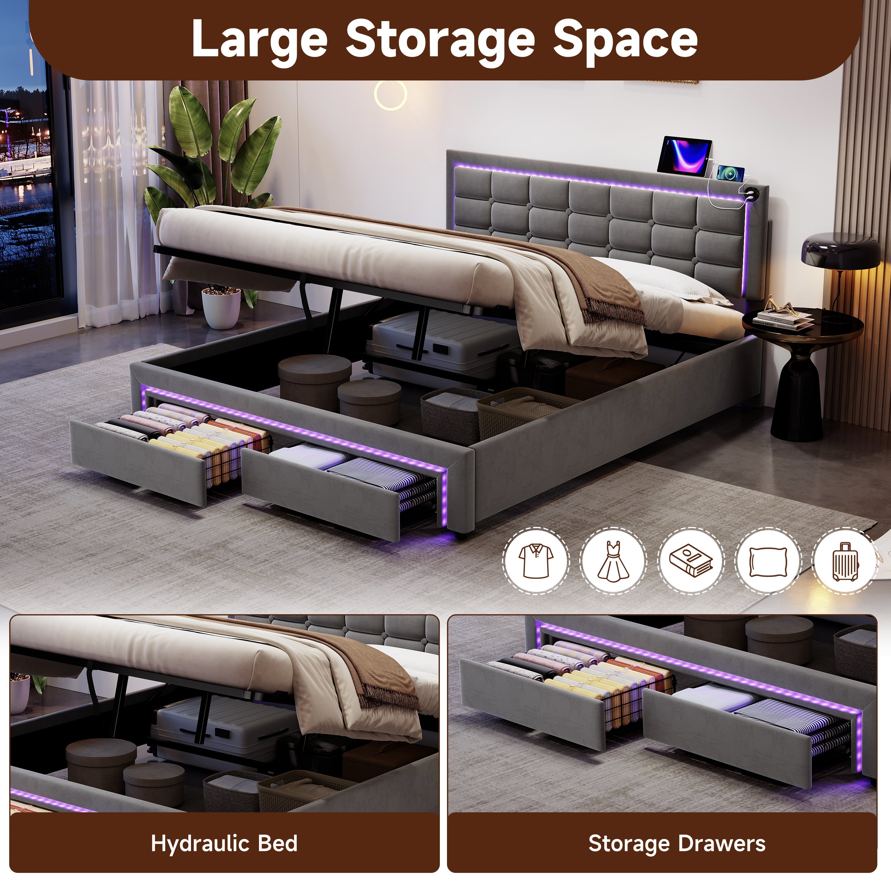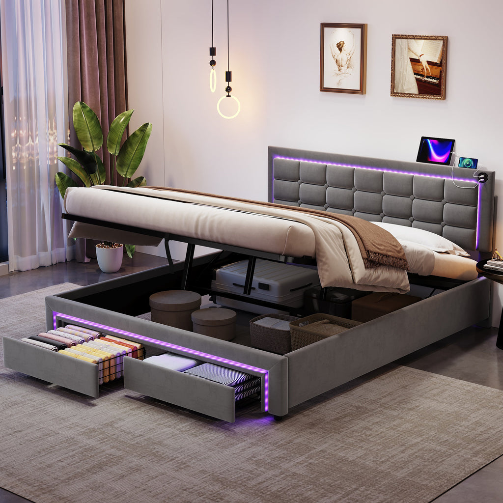 4ft6 Double Upholstered Bed Frame, Hydraulic Storage, LED Headboard, Charging Station, Grey Velvet