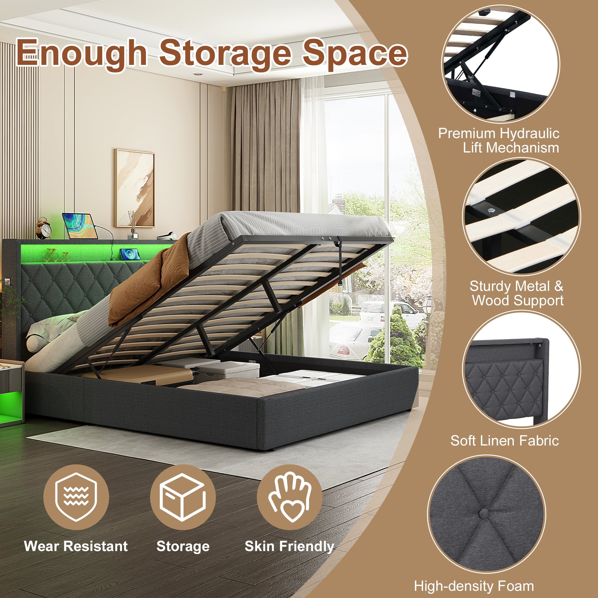 Special Features include: Ample storage space (hydraulic storage, headboard storage, and side pockets), colorful LED lighting strips, a charging station (Type-C port, USB port, and Power Outlet), wear-resistant linen fabric, and sturdy metal-wood support.
