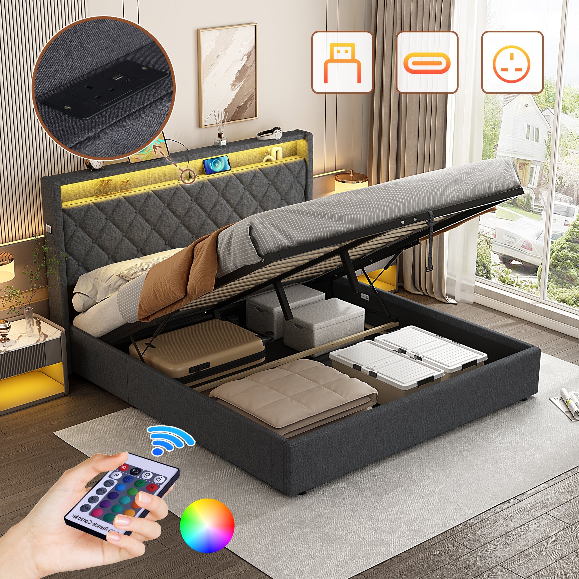 5ft King Upholstered Bed Frame, Hydraulic Storage LED Headboard Charging Station, Linen Grey