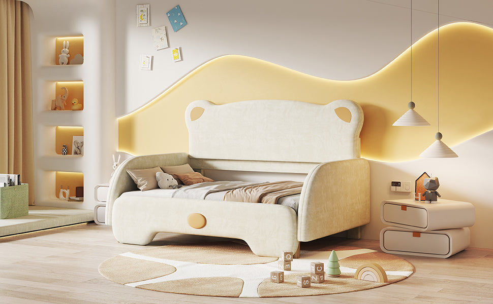 Bear Double Bed, Upholstered Children's Day Pull-out Bed, Velvet Beige