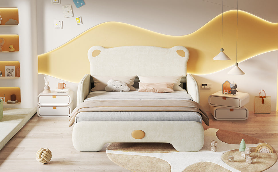 Bear-Shaped Double Bed, Upholstered Bed, Kids' Bed, Trundle Bed, with Soft Protective Edges, Velvet, Beige.