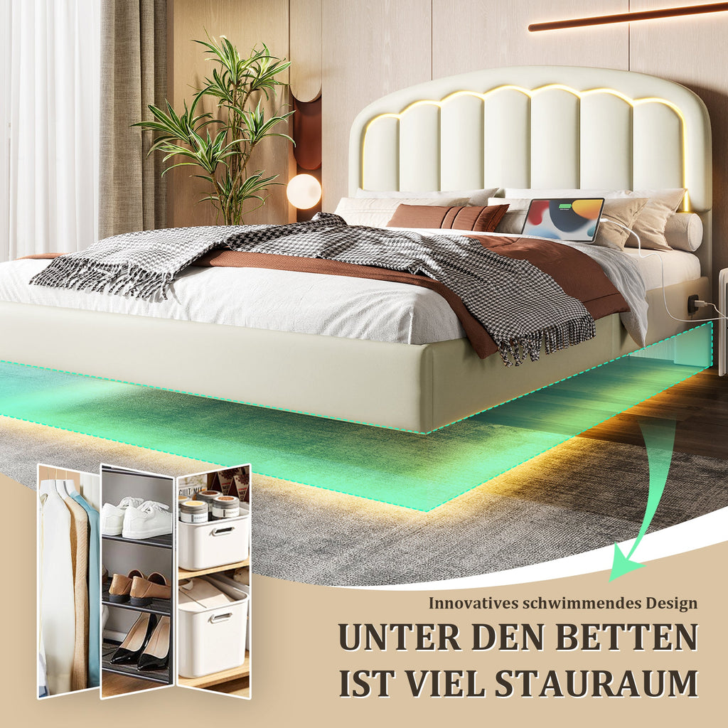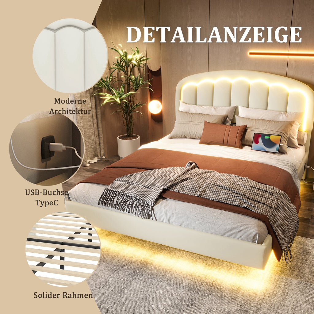 Bed, Floating Design LED, USB-C, Petal Headboard, Storage, White