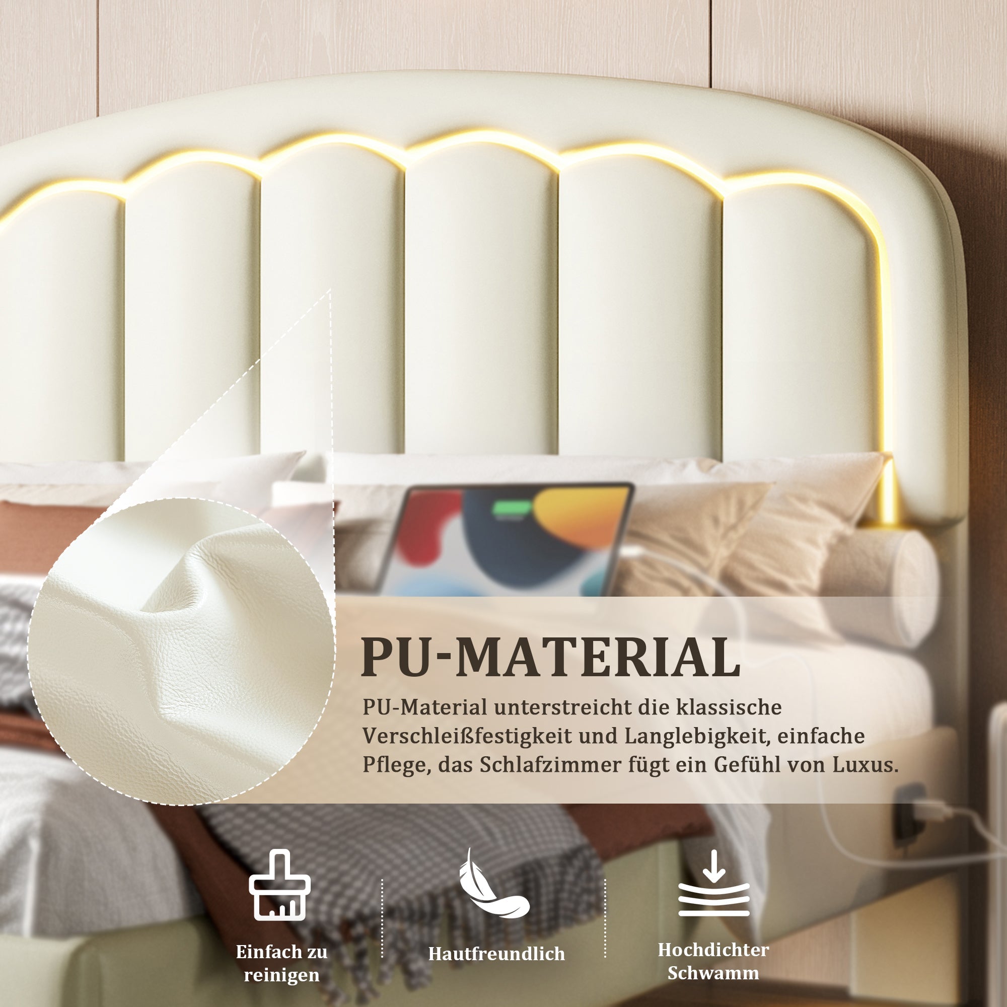 The modern bed design with integrated USB Type-C ports on the side panel makes charging your devices a breeze. Whether it is a smartphone, tablet, or e-reader, you can comfortably charge your favorite devices while lying down without having to search for power outlets. The cleverly placed USB-C port guarantees fast charging and always-accessible technology.