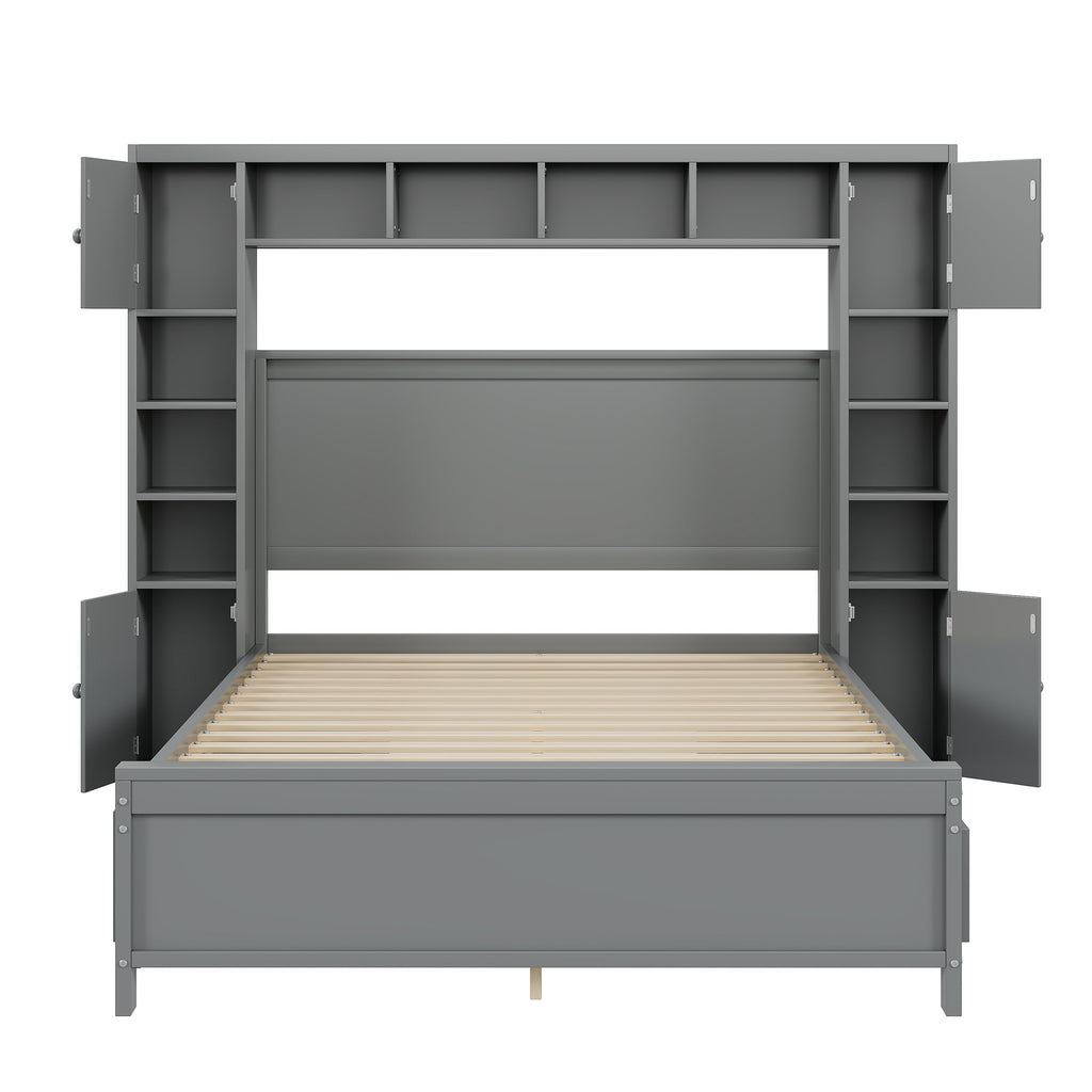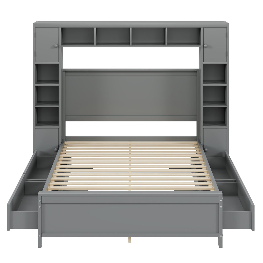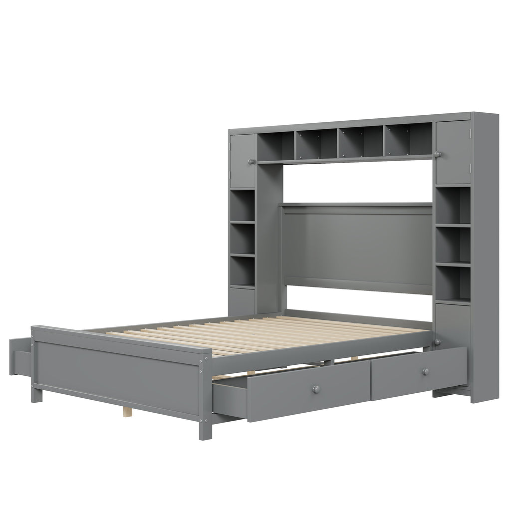 Bed Frame, 140x200 with 4 Drawers & Storage Cabinet, Solid Wood, Grey