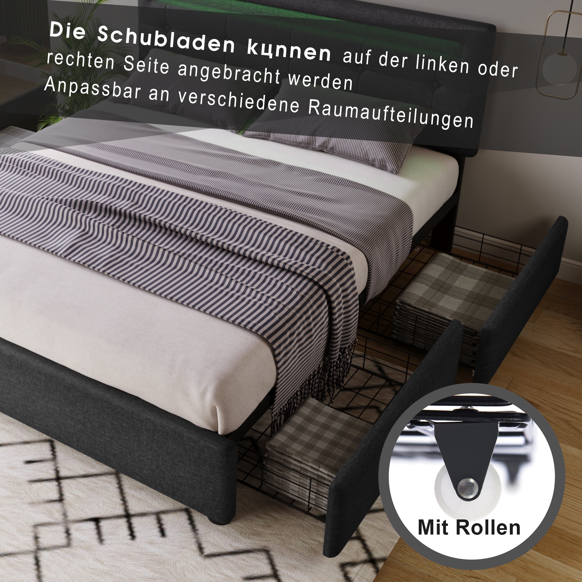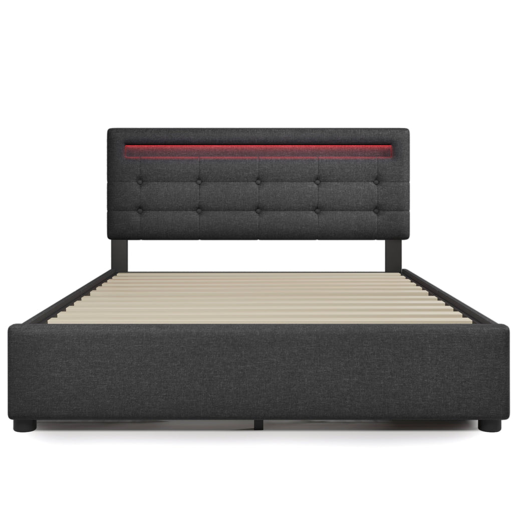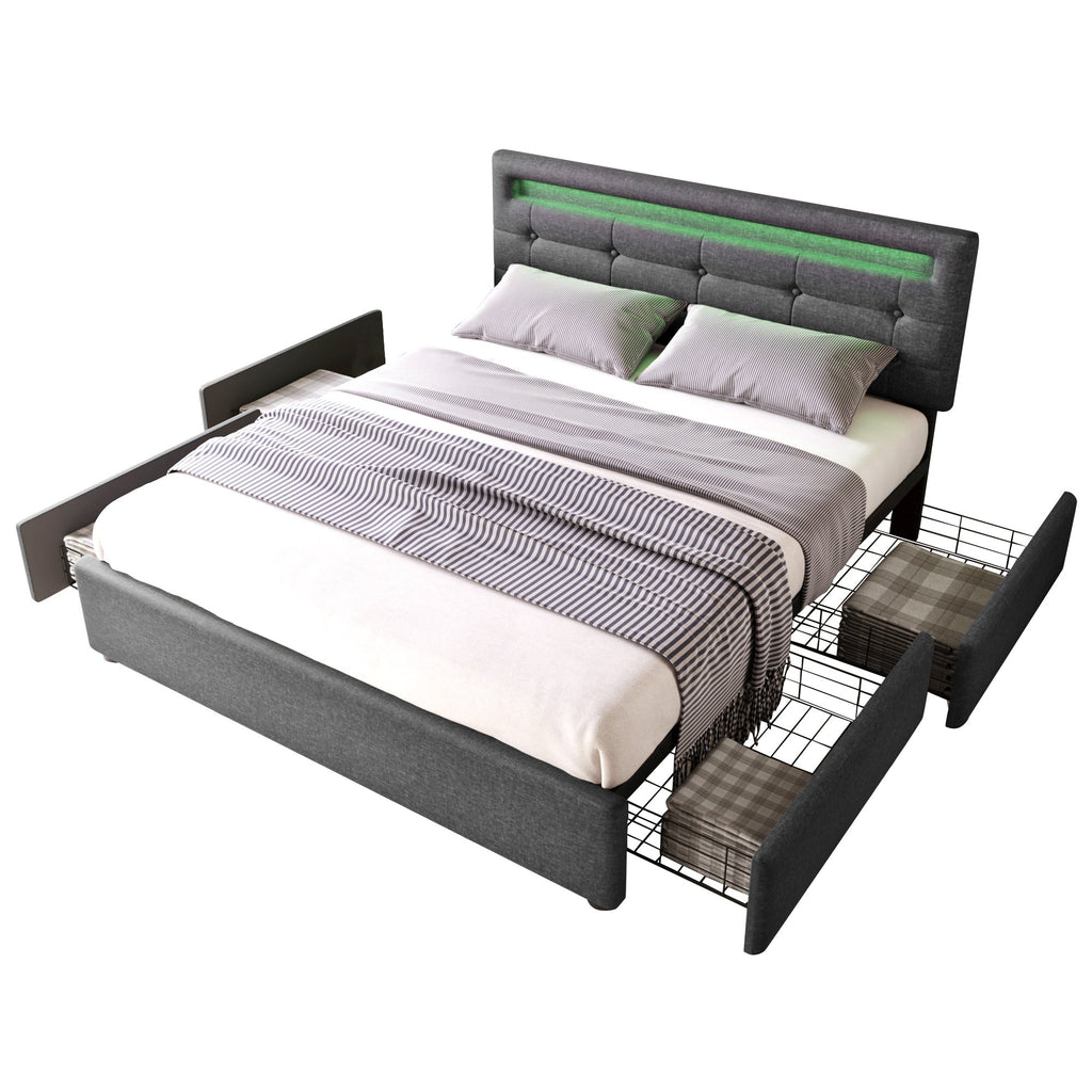 Bed Frame, 140x200cm, LED, 4 Drawers, Adjustable Headboard, Wooden Slats, Grey