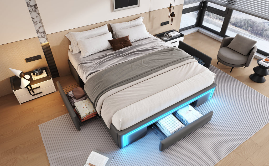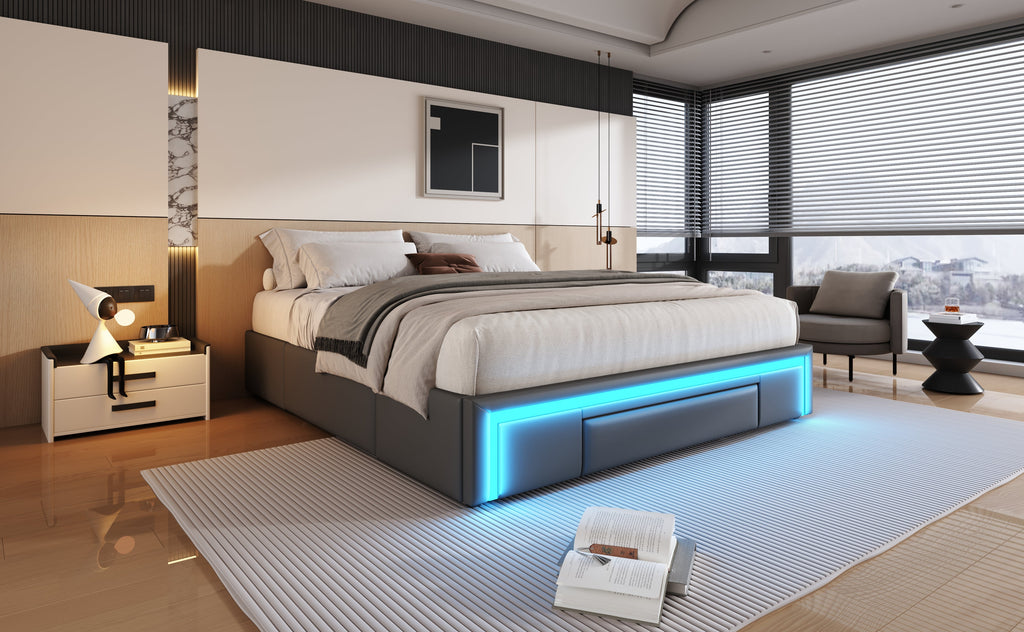 The bed frame features several spacious drawers—ideal for bedding, clothes, or accessories—to keep things organized. The high-quality PU leather upholstery offers a premium feel, is easy to care for, and durable—perfect for everyday use. For an even more beautiful nighttime experience, this bed frame includes a color-changing LED light strip at the foot of the bed. The remote-controlled lighting provides atmospheric illumination that adapts to your mood or surroundings—whether you're relaxing in bed, reading, or watching TV.