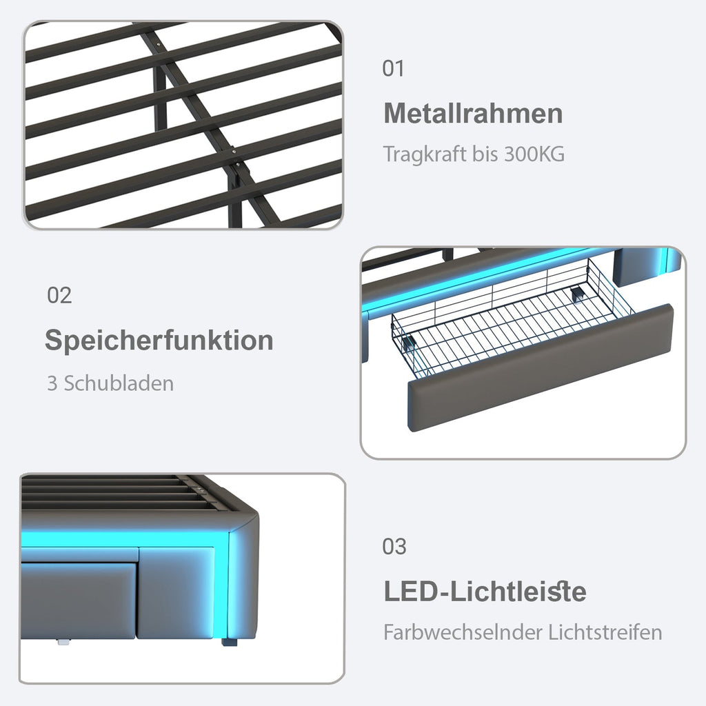 Bed Frame 160x200 with Drawers, LED Light Bar, Metal Slatted Platform, PU Leather Gray