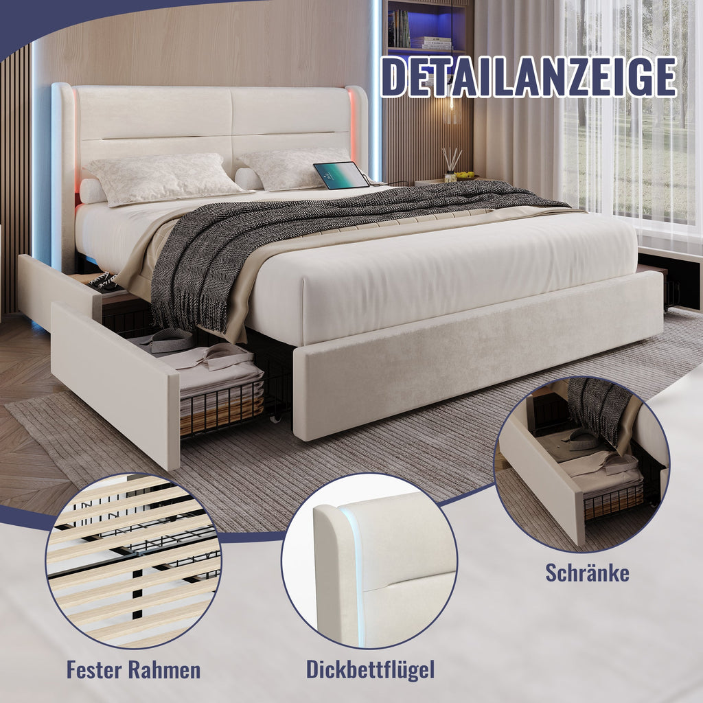 Bed Frame, 160x200cm LED Headboard 4 Storage Drawers Dual USB, Beige