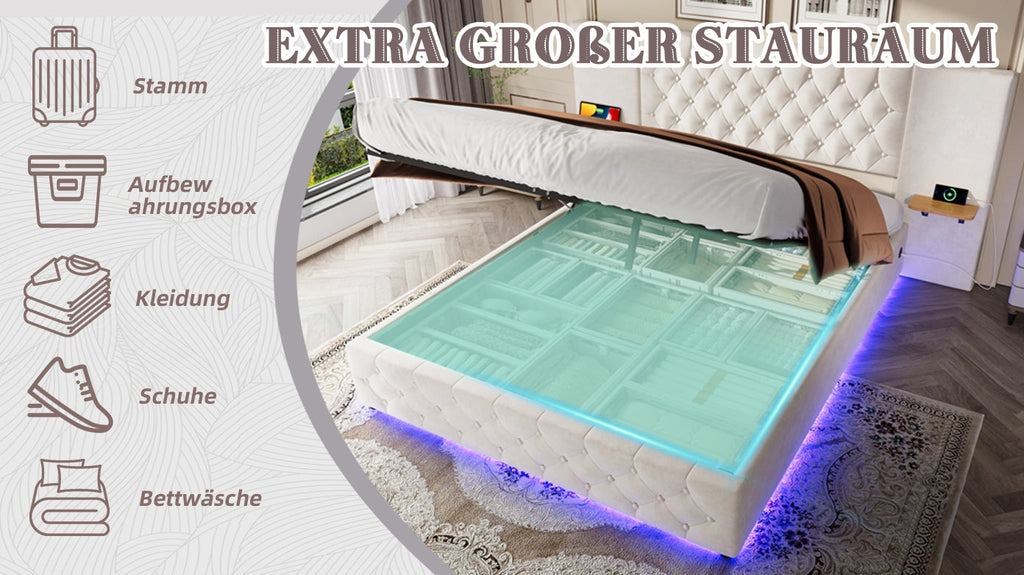 Bed Frame, 160x200cm LED & USB, Hydraulic Lift Storage