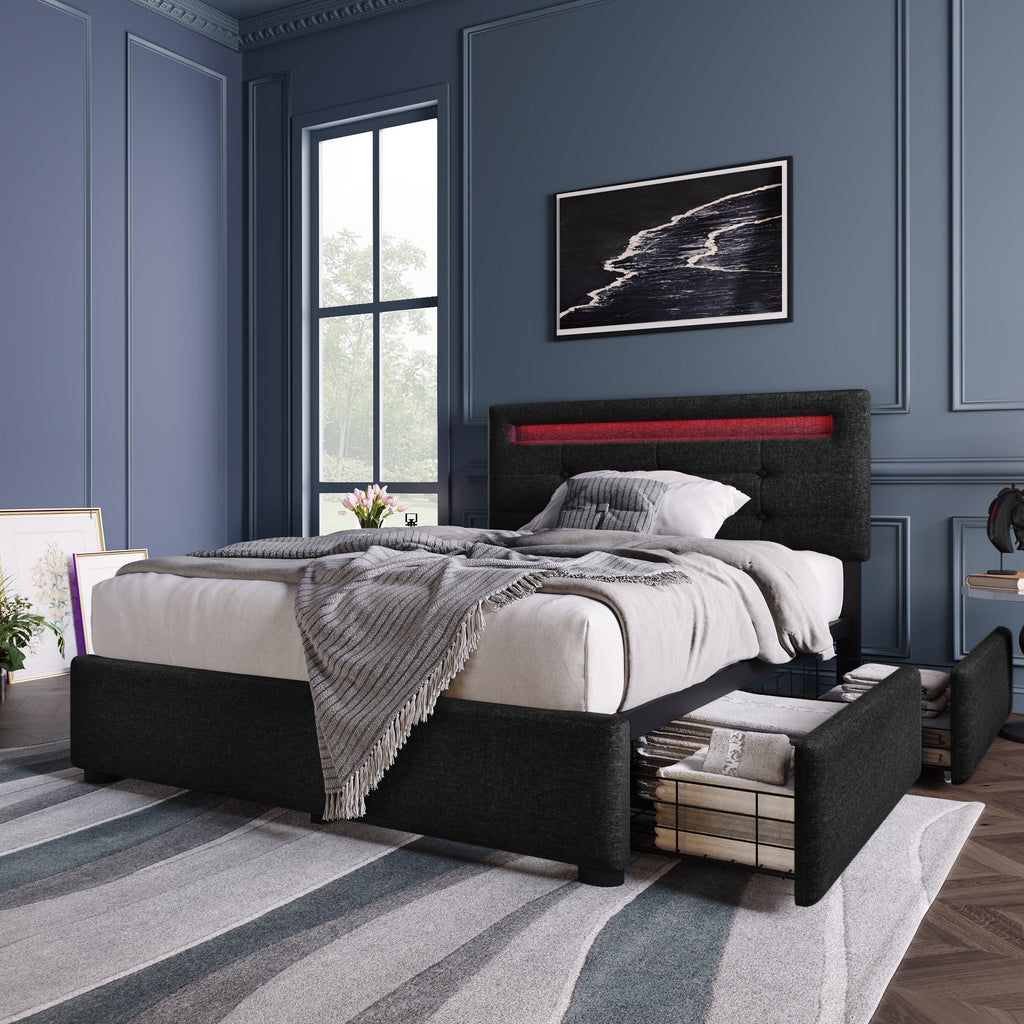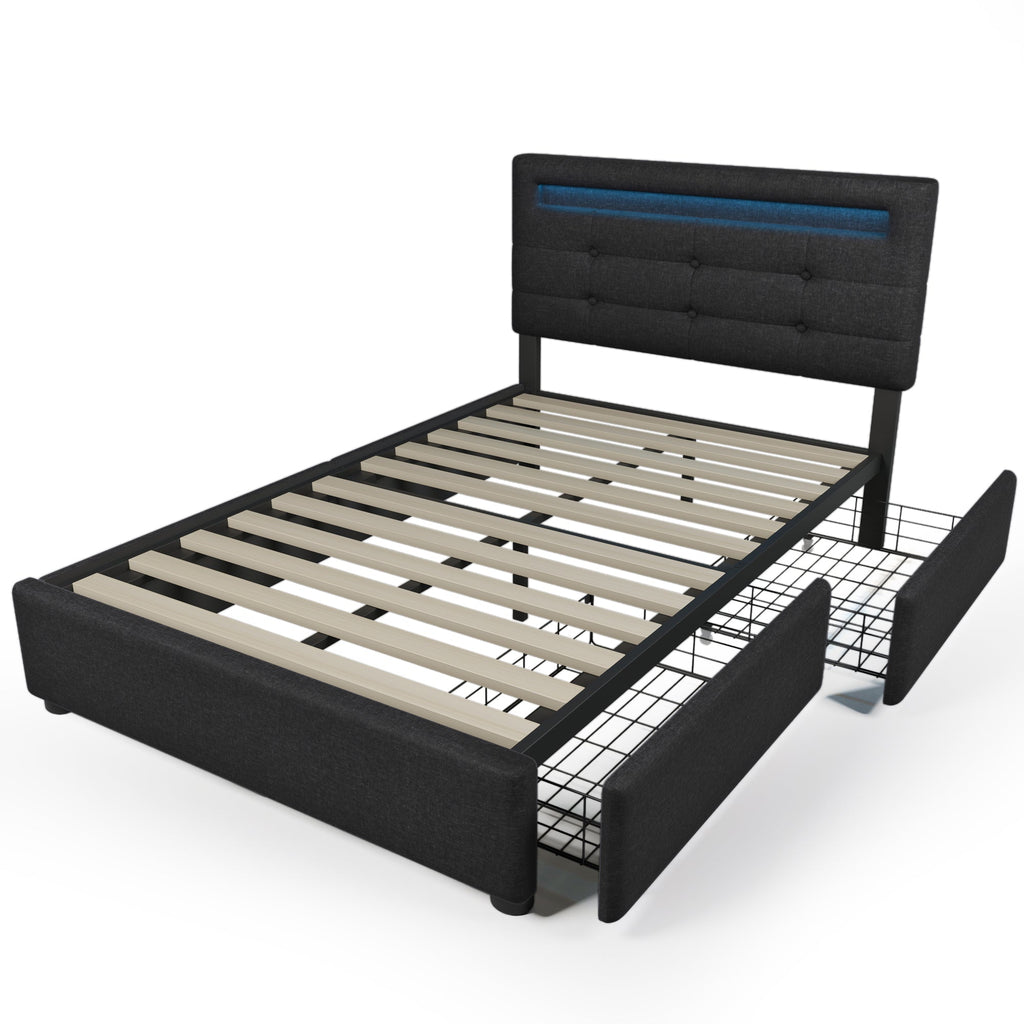Bed Frame, LED Lighting, 2 Drawers, Adjustable Headboard, Black