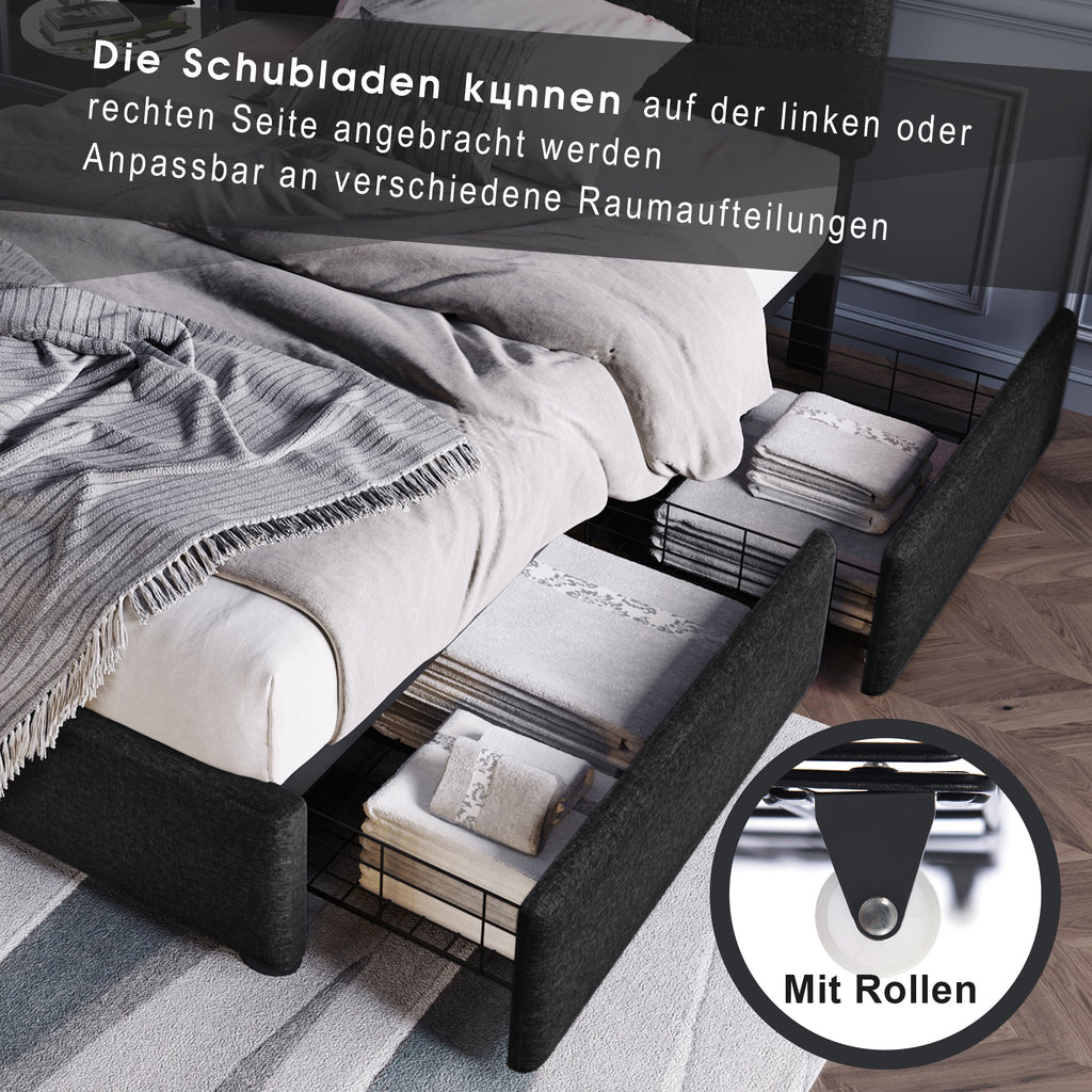 The panel material is linen and the color is black. The maximum user weight is 136 kg (300 lbs). The headboard distance is 16-26 cm and is adjustable by ± 9.5 cm. No box spring is required, and assembly is required. The package contents include the bed frame and two drawers. The applicable mattress size (mattress not included) is 90 x 200 cm. The package quantity is 2. The inner dimensions of the drawers are 75 x 50 x 15 cm (D x W x H).