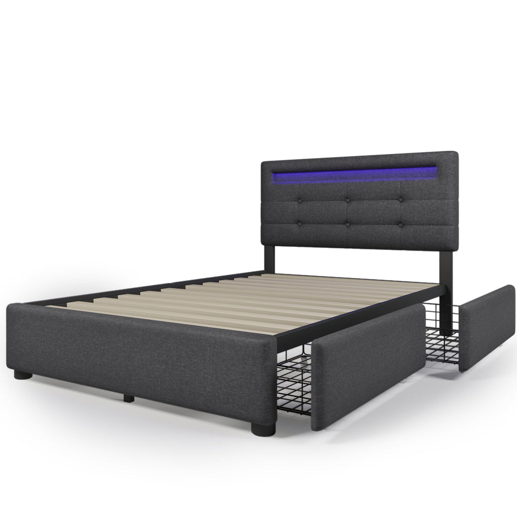 Bed Frame, LED Lighting, 2 Drawers, Adjustable Headboard, Upholstered, Grey