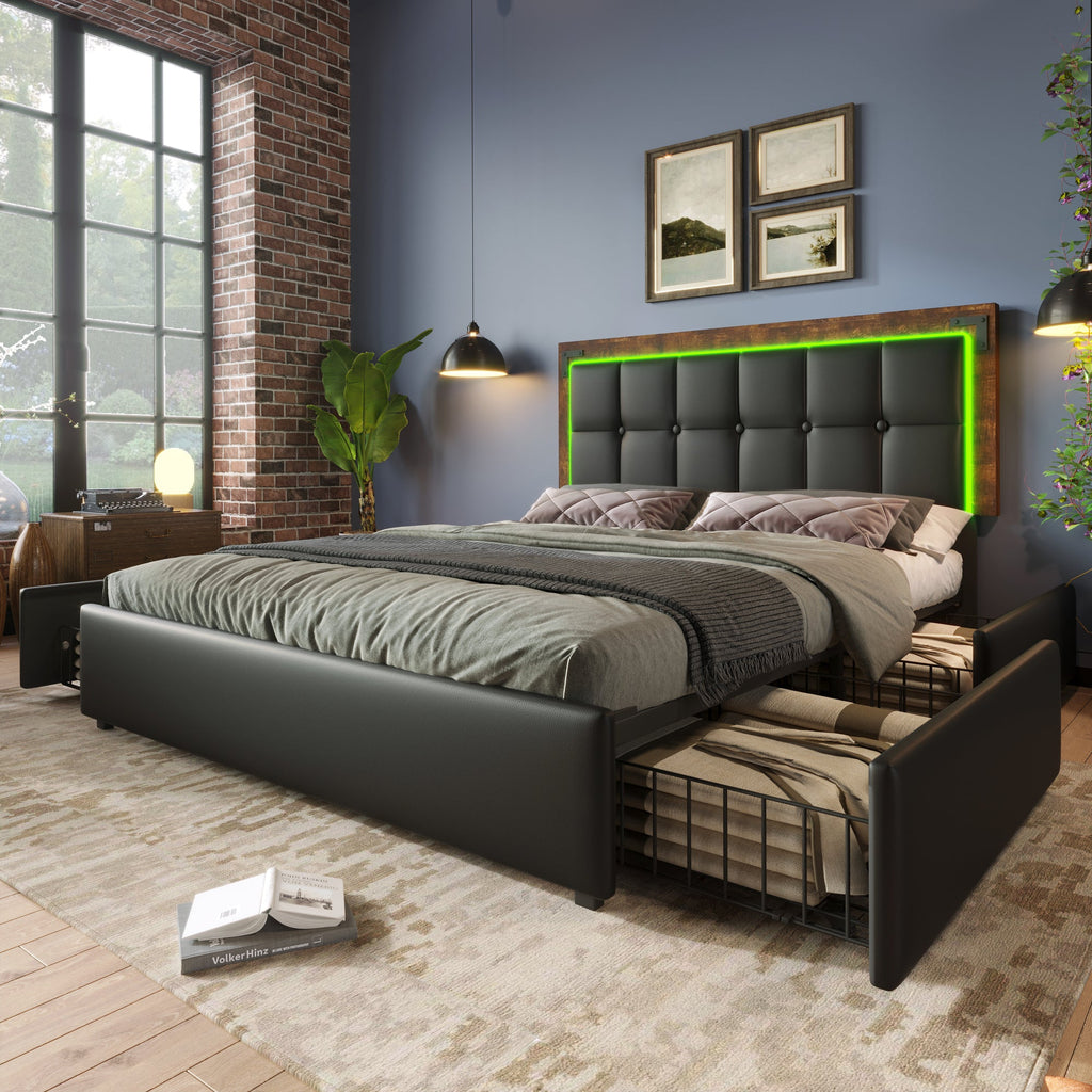 Bed Frame, LED Lighting, 4 Drawers, Adjustable Headboard, Double, PU Black