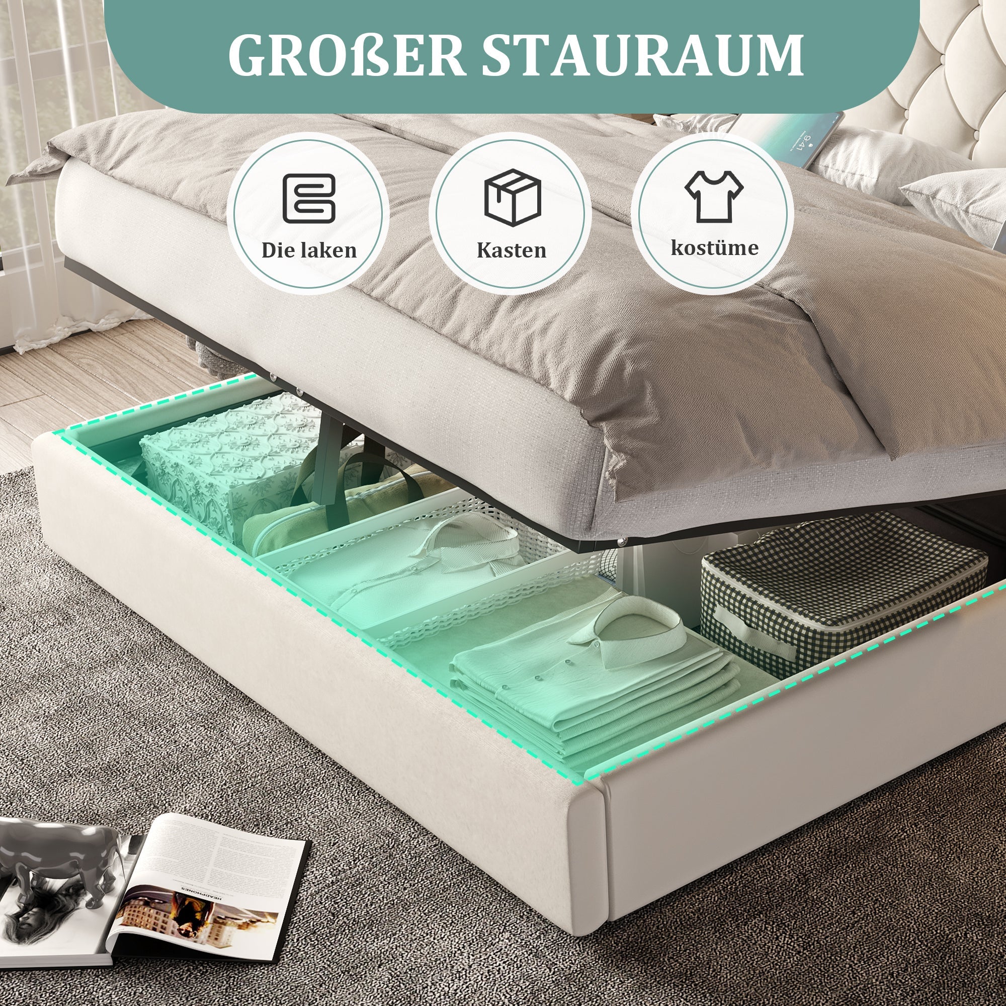 Ample, hidden storage space is located underneath, perfect for storing suitcases and storage boxes. This allows you to make the most of limited space, creating a neater and more organized bedroom. Don't worry about cluttering your bedroom; this bed frame helps keep your room tidy and clean.