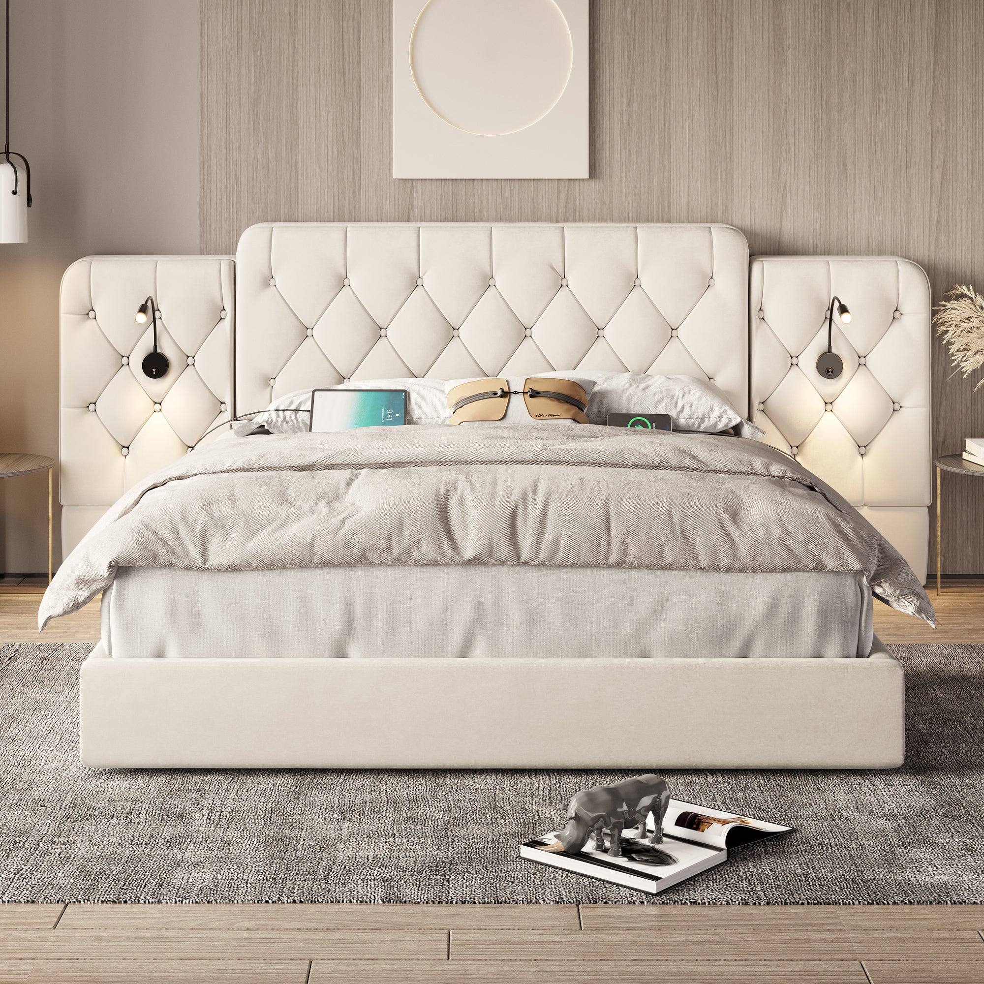 Bed Frame Long Headboard USB/Lamp Hydraulic Storage 160x200cm, Velvet Beige