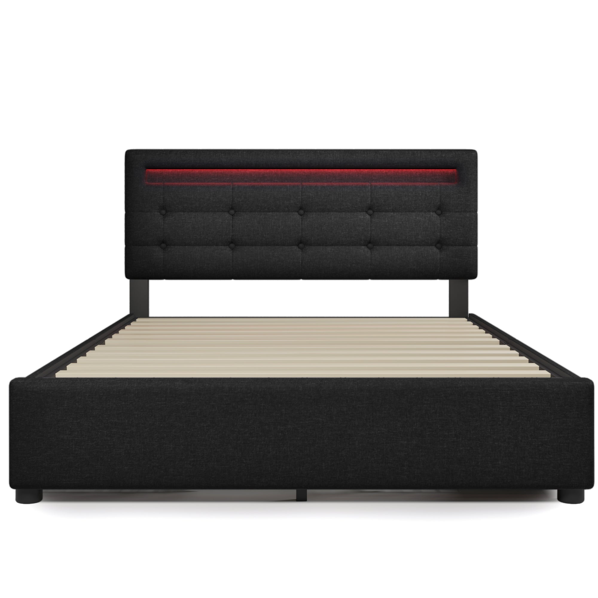 Bed Frame with Mattress, LED Lighting, 4 Drawers, Height-Adjustable Headboard, Wooden Slatted Frame, Black